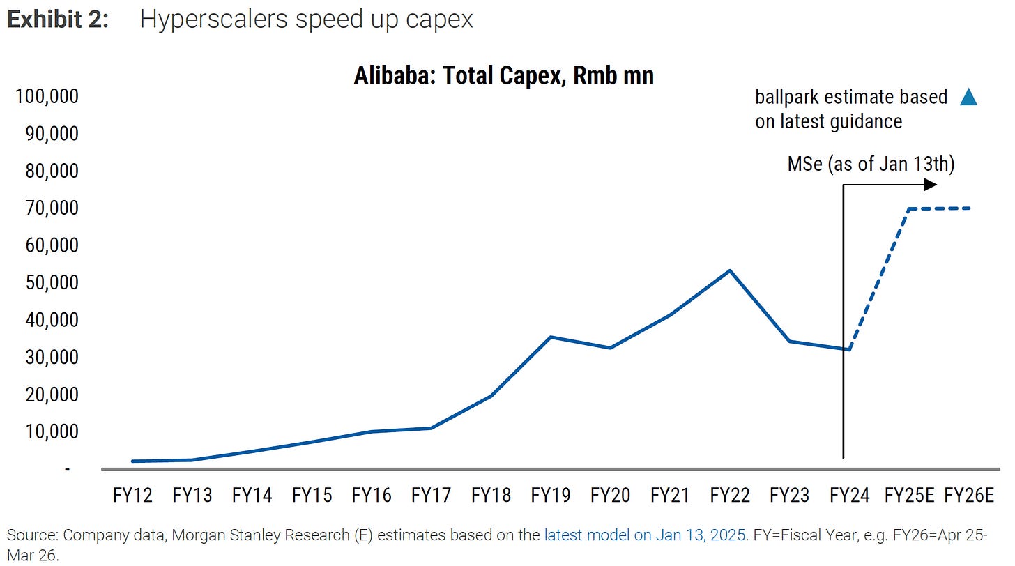 阿里巴巴近日宣布了一項資本支出計劃,市場對此反應熱烈,遠超預期。這與大摩科技分析師的觀點一致——中國幾款低成本的人工智慧大模型(LLM)使訓練和推理成本降低,將加速這些技術的應用。