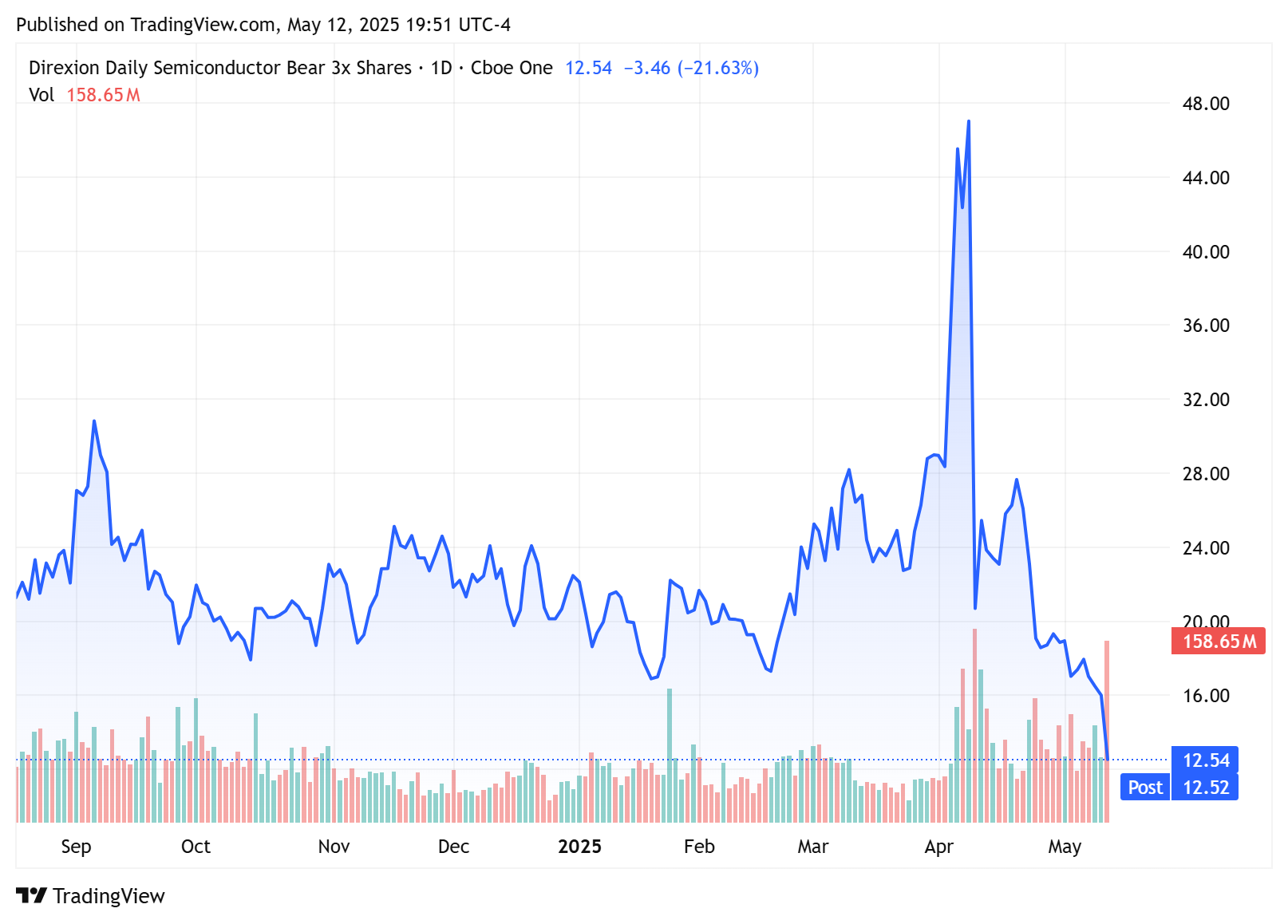 空頭慘遭狙擊,SOXS 單日暴跌 21.6%,創年內新低。