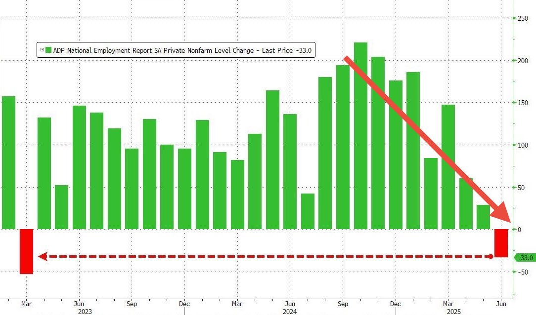 6月ADP小非農:意外減少3.3萬人(預期 +9.8萬,前值 +3.7萬),為2023年3月以來最差表現。