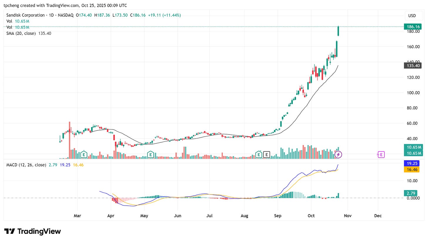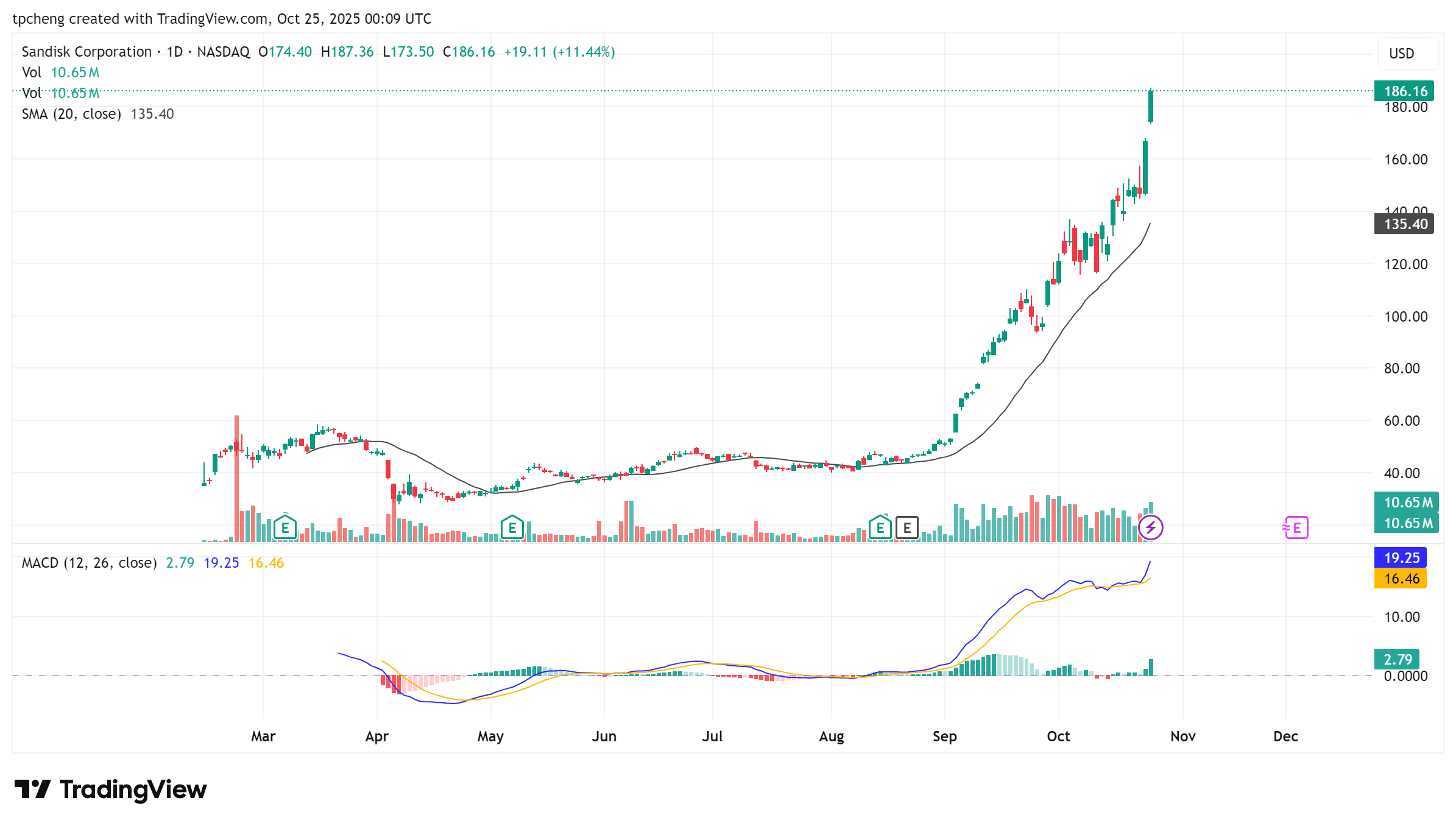 SanDisk:連漲兩日(+11.5%,前日+14%),年內漲幅超1130%。