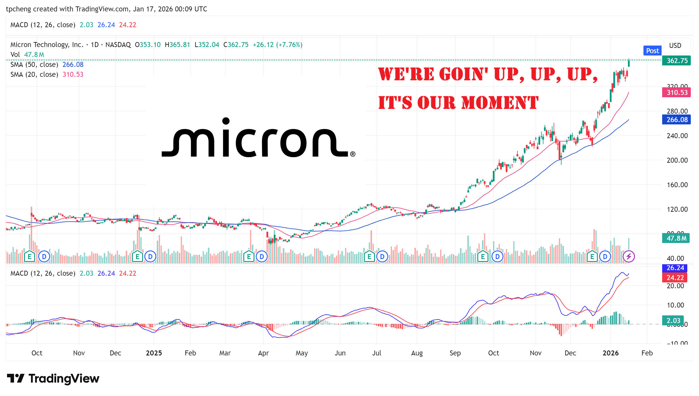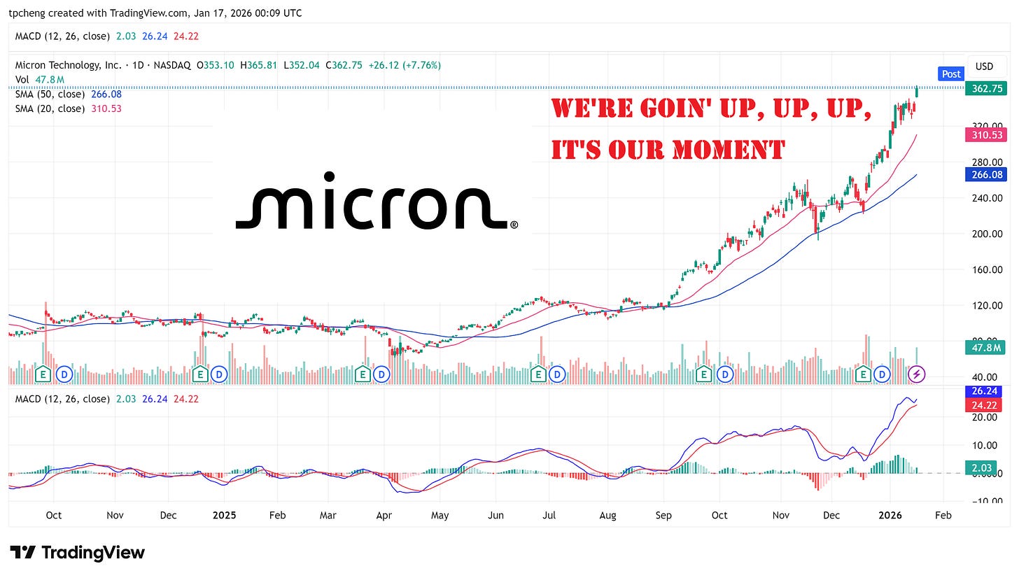 由於美光股價在過去 12 個月已上漲近 250%,且 2026 年初至今已上漲約 25%,此時進場被視為極具看多的訊號 。