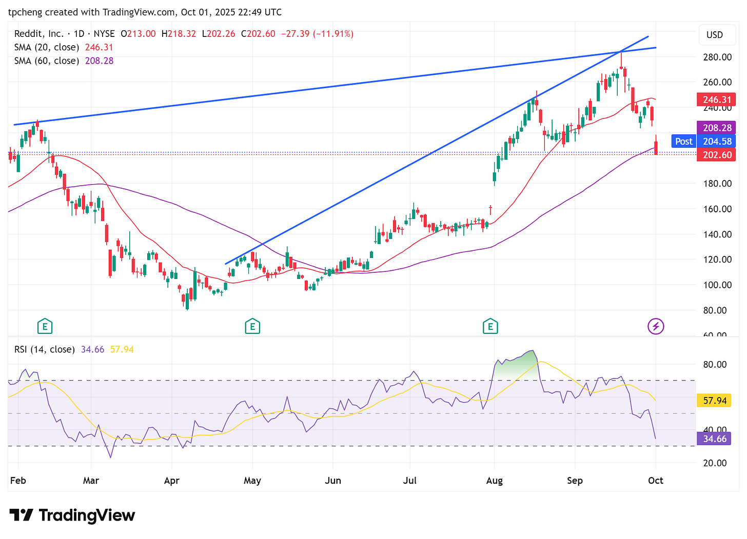 Reddit(RDDT):日活用戶下降 + 在 ChatGPT 引用份額從 29.2% → 5.3%,引發數據價值疑慮,股價大跌。