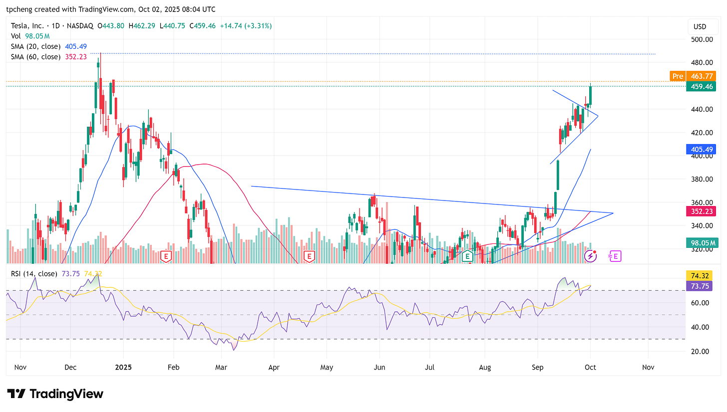 Tesla(TSLA):交付數據前上漲 3%,受稅收抵免政策驅動,但需求可能被透支。重心轉向 AI / Robotaxi 故事,預計 2025 推出 Optimus Gen3。