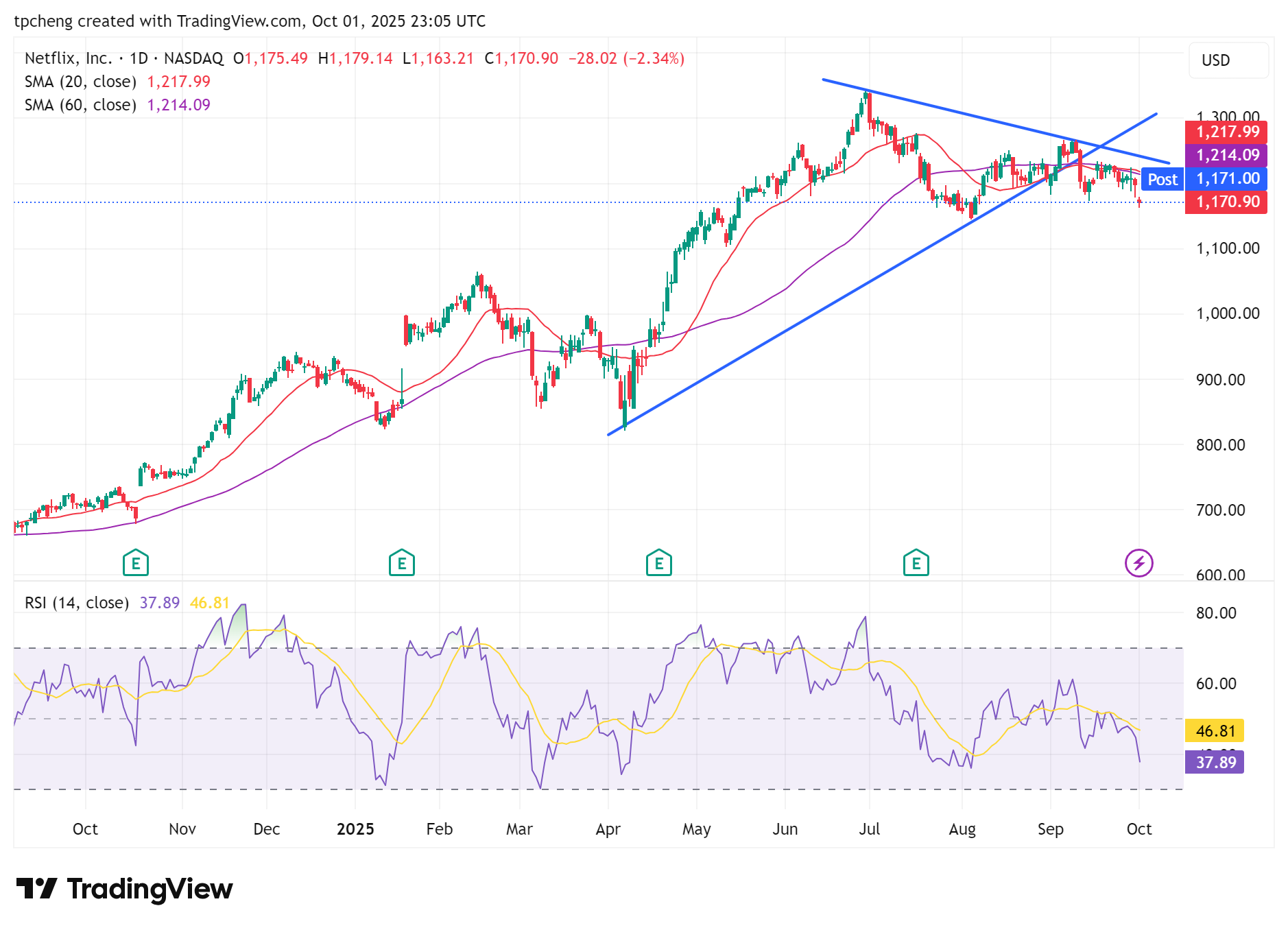Netflix(NFLX):因關稅與政治爭議(馬斯克號召抵制)承壓,股價走弱。