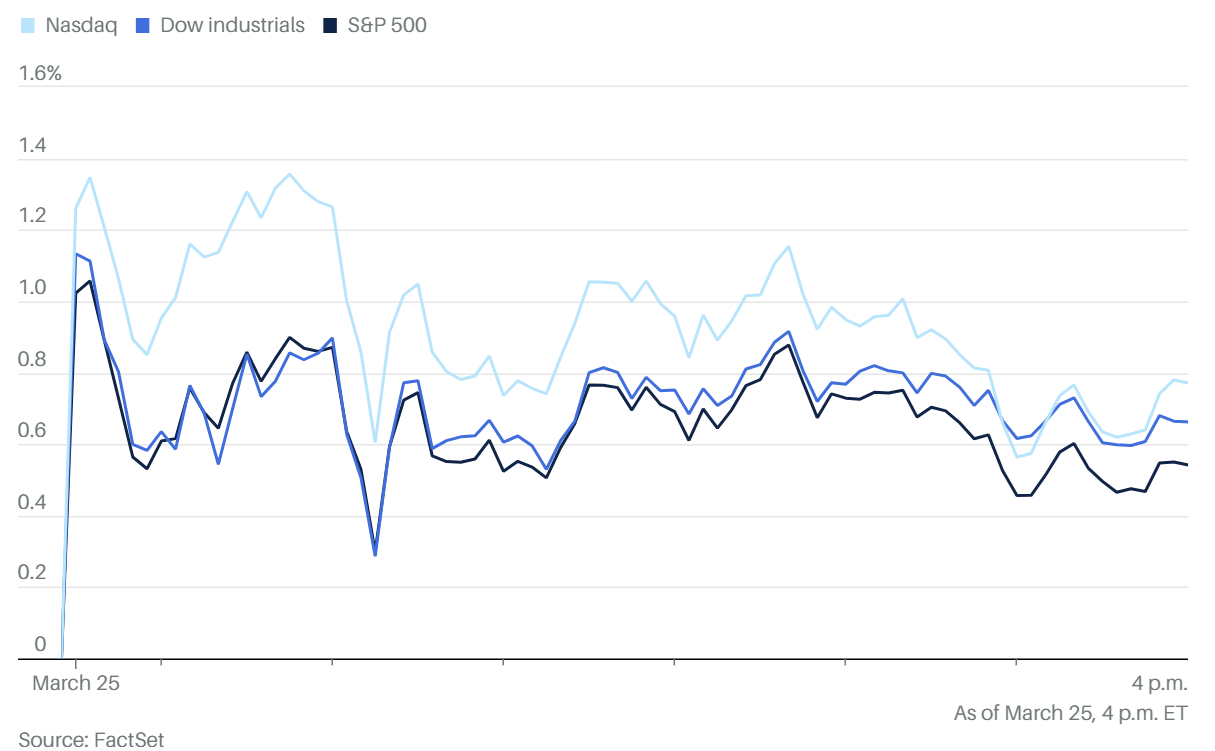 2026 年 3 月 25 日,美國股市在經歷了一段時間的震盪後展現了強勁的韌性。三大股指全線收高,主要驅動力來自於市場對中東局勢可能降溫的謹慎樂觀情緒 。