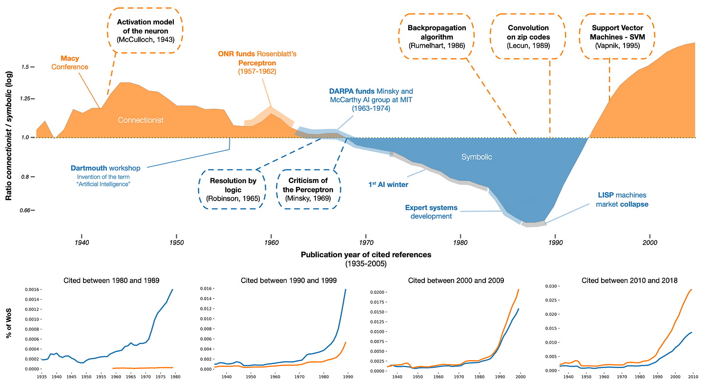符號主義強調邏輯與規則,試圖透過形式化的符號系統模擬人類的理性思維;而連接主義則從生物學出發,模仿人腦神經網路,依靠數據與訓練來實現智能。以下將結合歷史脈絡,詳細講述這場競爭的演變,以及連接主義如何在21世紀初脫穎而出,成為當今AI的主流範式。