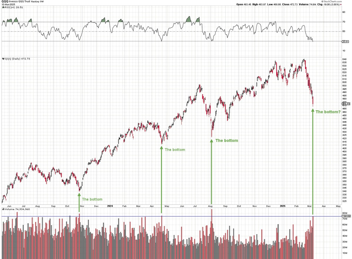 3月10日,QQQ(S&P 100 ETF)的交易量創下自2023年10月以來的第四高。值得注意的是,前三次交易量激增都伴隨市場大幅下跌,散戶投資者往往在這些時點集體停損。「歷史總是驚人的相似,但不會簡單重複。」每次市場下跌雖有獨特背景,但投資者似乎總難從中吸取教訓。