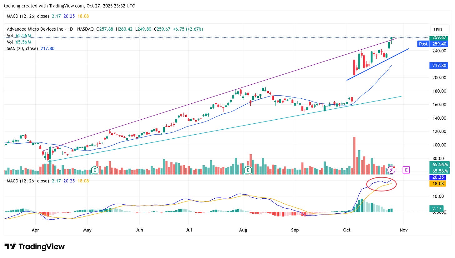 AMD:再創歷史新高。與美國能源部簽署 10 億美元超算合作計畫,用於核能、聚變、國防與藥物研發。這次上漲不再是炒作,而是基本面與訂單雙支撐,重新奪回 AI 晶片市場份額。