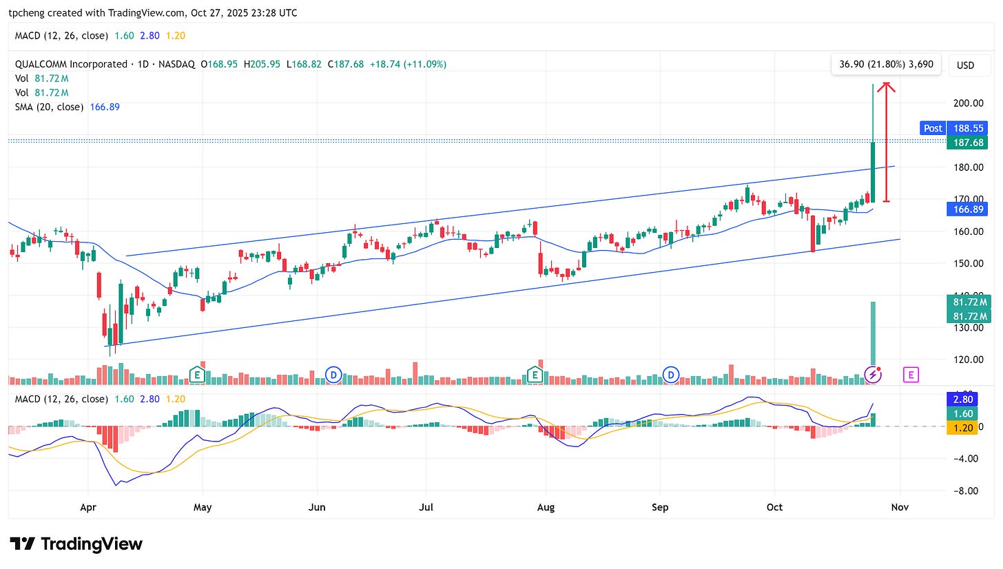 Qualcomm(QCOM):上漲 11%,盤中一度飆升 20%。發表兩款具神經處理單元(NPU)與液冷設計的新 AI 晶片,正式進軍資料中心市場。公司表示將採每年產品迭代節奏,效仿 Nvidia 與 AMD。