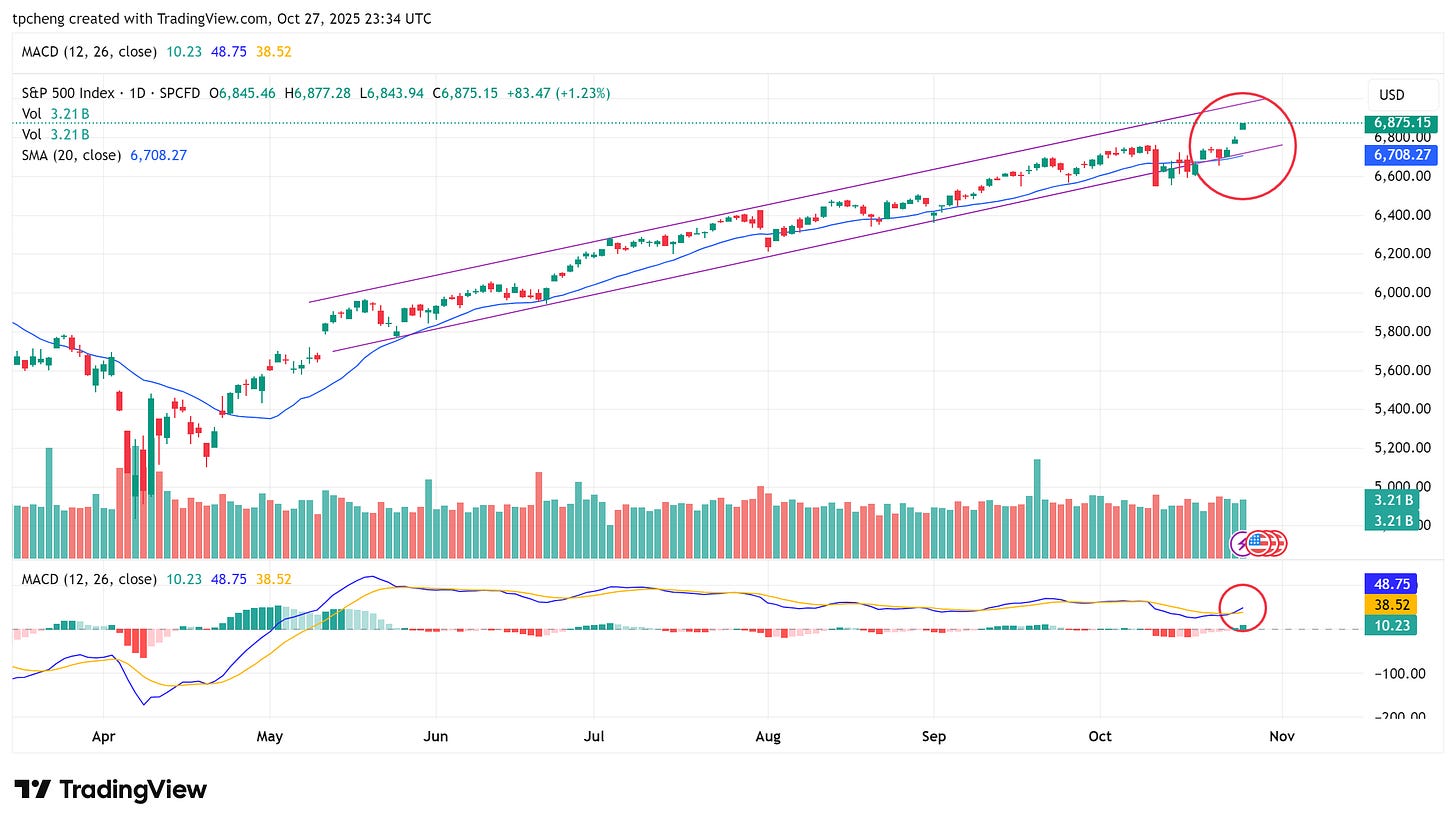 美股三大指數全面上攻,尾盤收在日內高點附近,連續創下歷史新高。標普500指數以跳空高開突破 6800 點,最高觸及 6877 點,距離 6900 僅一步之遙。連續兩個跳空缺口凸顯多頭動能之強。
