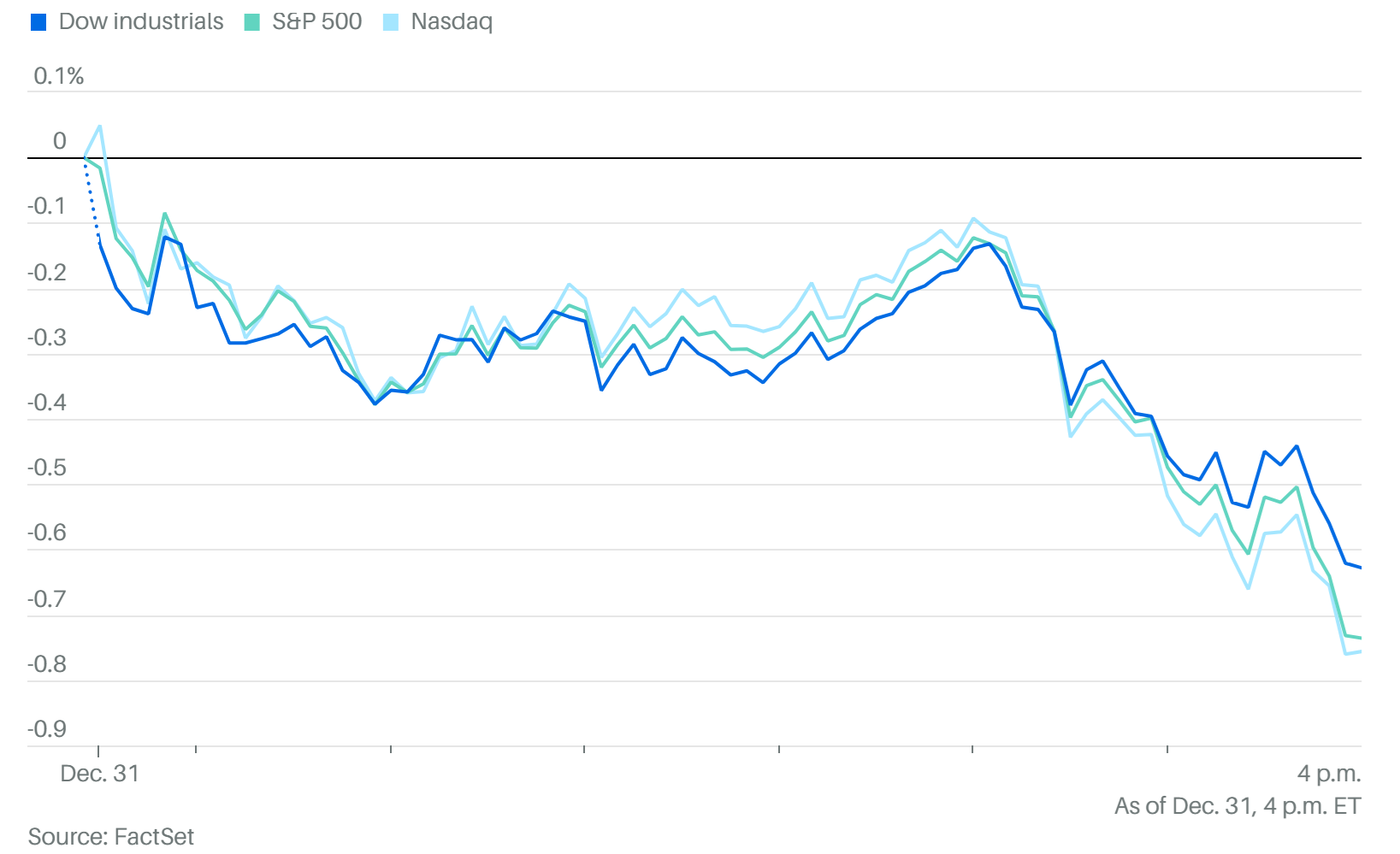 年末走勢:2025 年最後一個交易日,受獲利了結和稅務虧損收割(Tax-loss harvesting)影響,三大指數收跌,這也是那斯達克指數自 1971 年創立以來,三大指數首次同時以連續四天下跌結束一年 。