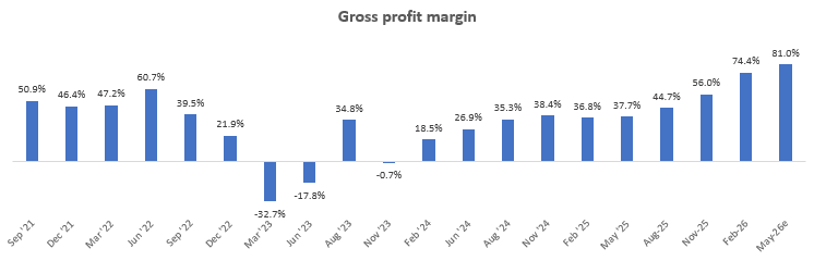 第一,現貨價格走平。DRAM 現貨價格不再上行,這在歷史上往往預示著合約價即將反轉。第二,資本支出顯著攀升。Micron 財報揭示的 Capex 計畫大幅高於市場預期,暗示未來供給將加速。第三,毛利率逼近歷史高點。Micron 最近一季的毛利率已來到 81%,接近記憶體產業從未長期維持過的水準。第四,需求端因短缺而出現負面影響——部分 PC 和智慧型手機的產線因記憶體不足而受到壓縮。