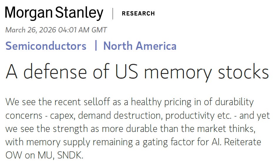 Morgan Stanley 在 2026 年 3 月 26 日發布了一篇針對美國記憶體股的研究報告,標題為「A defense of US memory stocks」,維持對 Micron(MU)和 SanDisk(SNDK)的加碼(Overweight)評級。報告的背景是記憶體股近期的明顯賣壓——投資人看到了一系列在過去週期中意味著見頂的訊號,選擇獲利了結。