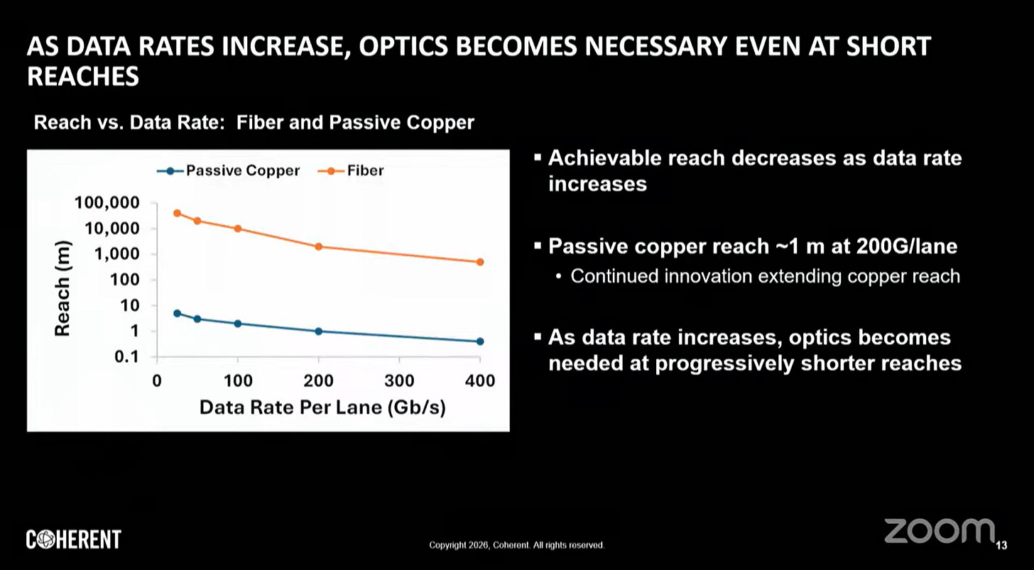 傳統上,光學互連(如光纖模組)主要用於 Scale Out(長距離傳輸)。然而,隨著 AI 算力需求暴增,Scale Up(短距離、高密度)領域正遇到「銅線瓶頸」。銅線在超過 2-3 公尺後的訊號衰減嚴重且極為笨重。