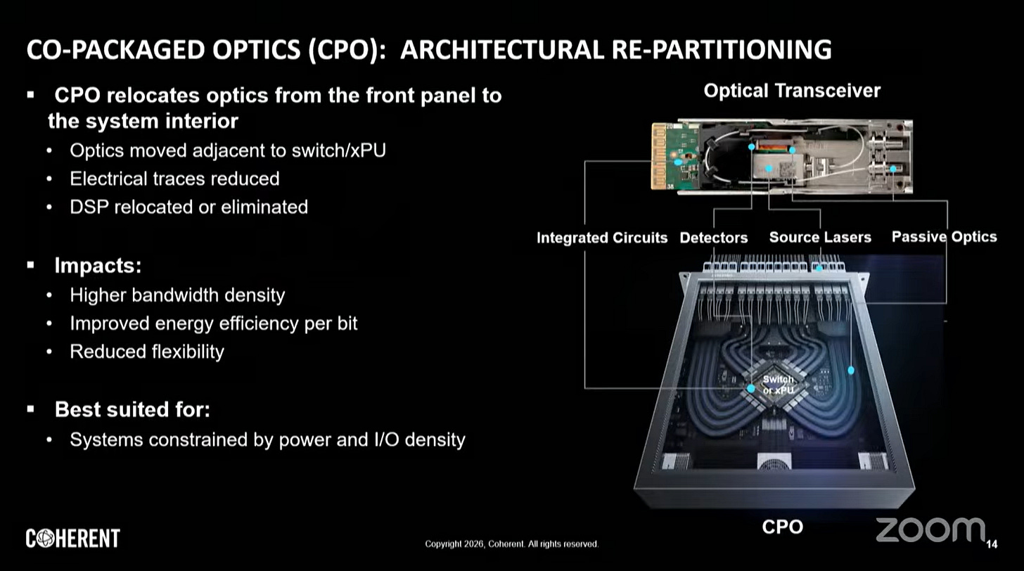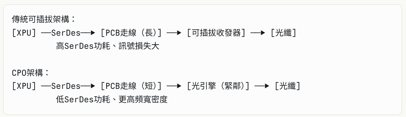 共封裝光學(CPO, Co-Packaged Optics)是針對Scale Up域高密度需求的架構性重構——將光引擎移至緊鄰交換器(Switch)或加速處理器(XPU)的位置。