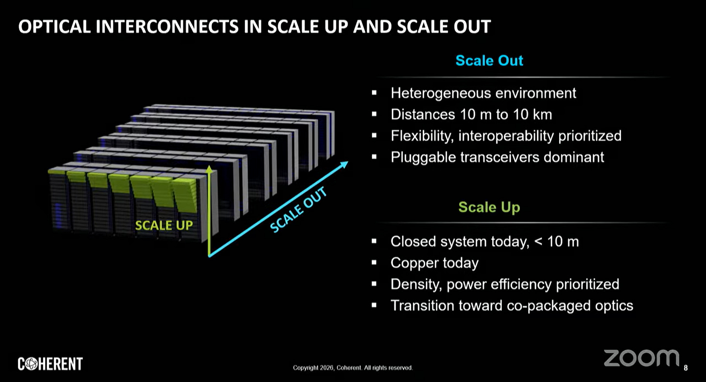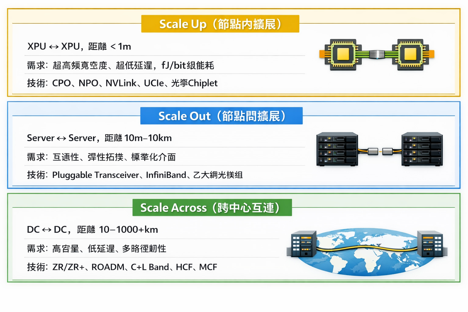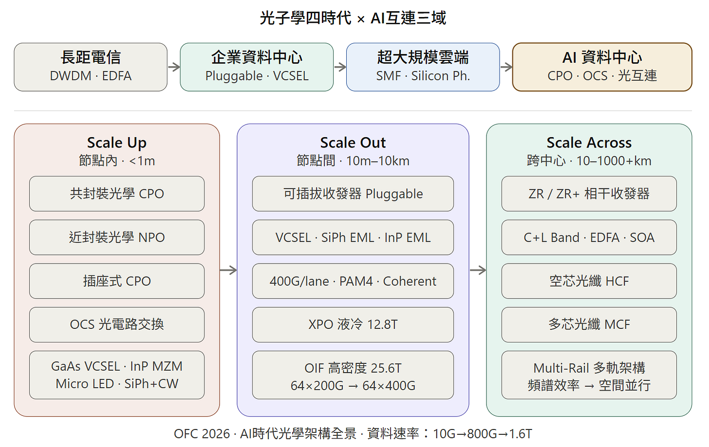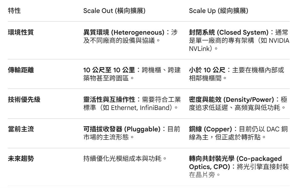 圖中特別提到 Scale Up 正在從「Copper today」轉向「Co-packaged optics」。這意味著為了維持 AI 集群內部的極速互連(例如 GPU 叢集的線性擴張),光學技術必須進入機櫃內部,甚至直接封裝在處理器旁邊,以解決散熱、空間限制與功耗問題。