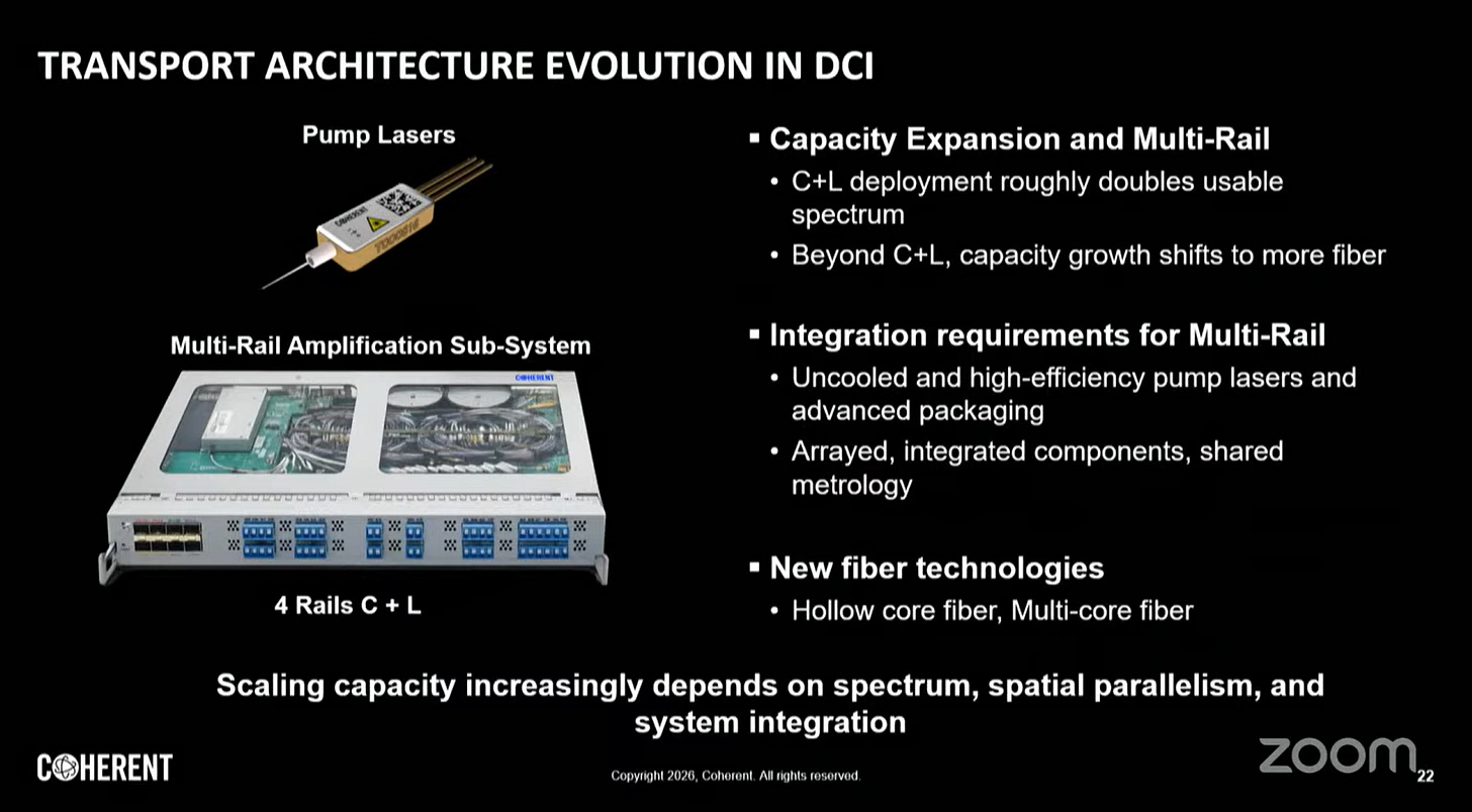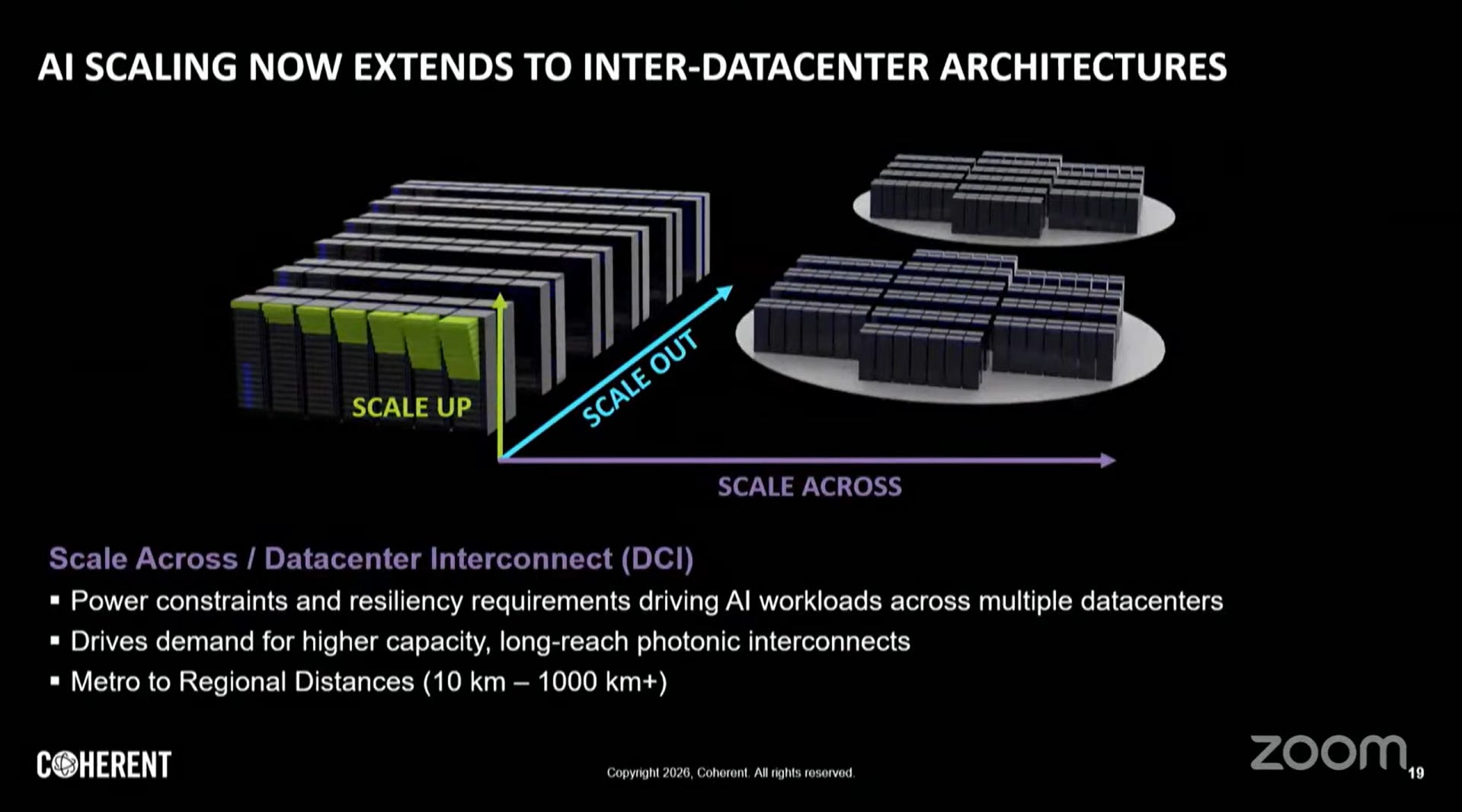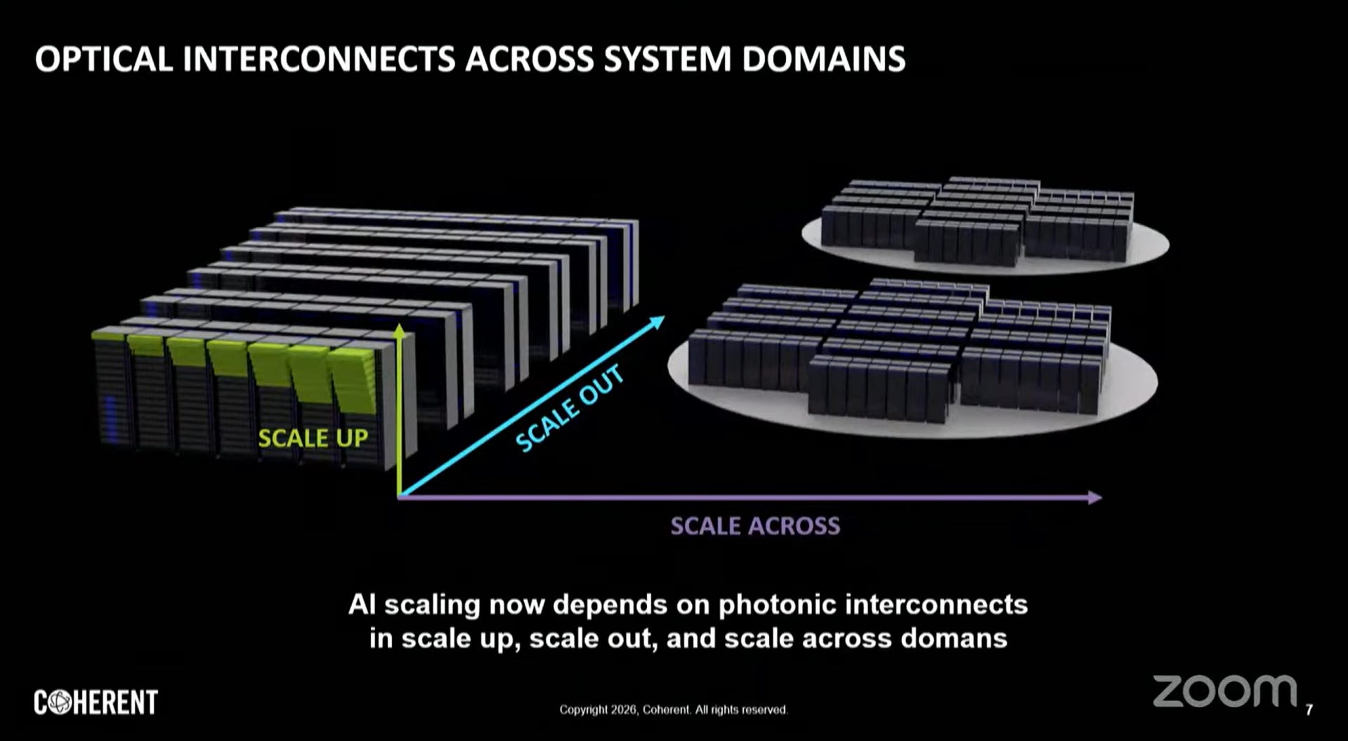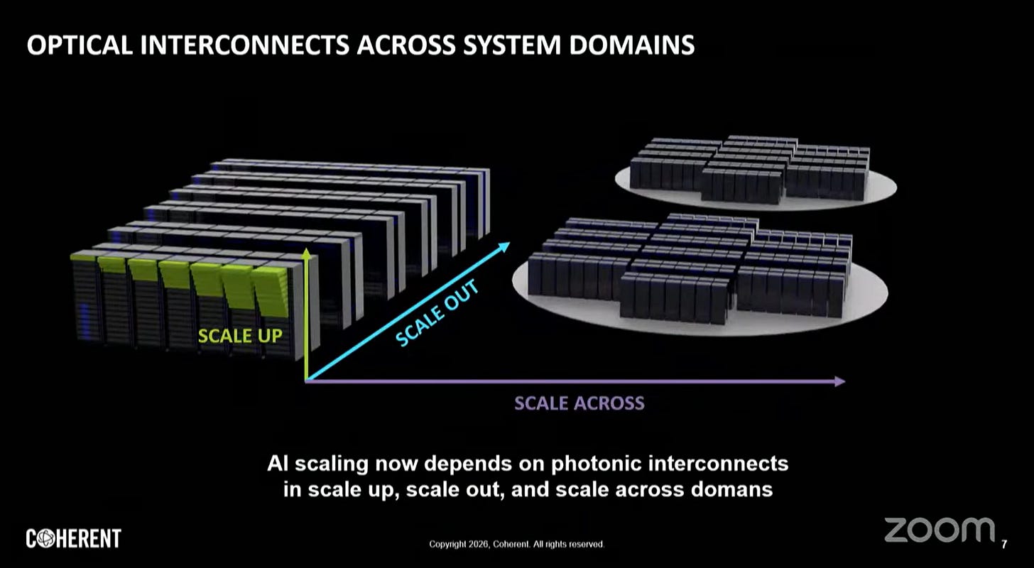 圖中特別提到 Scale Up 正在從「Copper today」轉向「Co-packaged optics」。這意味著為了維持 AI 集群內部的極速互連(例如 GPU 叢集的線性擴張),光學技術必須進入機櫃內部,甚至直接封裝在處理器旁邊,以解決散熱、空間限制與功耗問題。