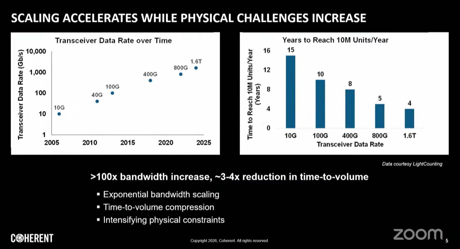 光收發器資料速率演進呈現指數增長,而更關鍵的是達到規模量產所需時間的急遽壓縮: