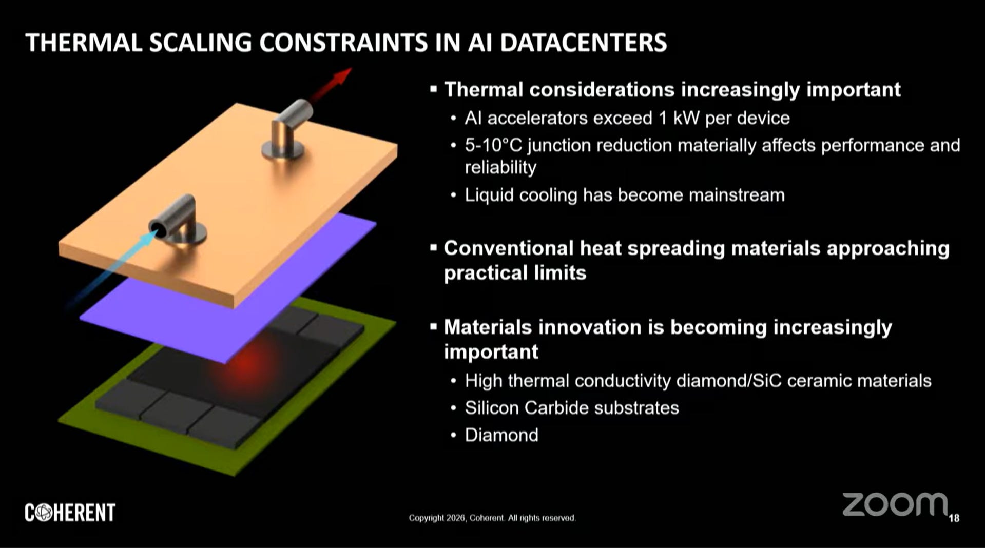 AI 加速器功耗已進入千瓦級(Kilowatt-class)時代(如 NVIDIA GB200 NVL72 機架總功耗超過 100kW),帶來嚴峻的熱管理挑戰: