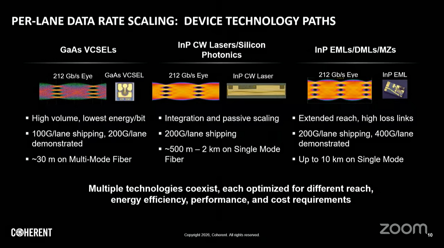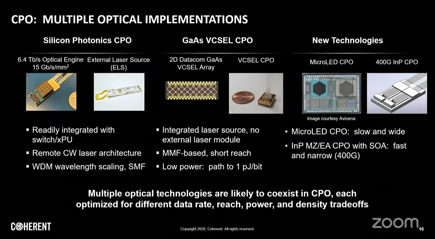 砷化鎵(GaAs)VCSEL型CPO 針對極短距(< 2m)、低功耗場景優化,適合節點內XPU間直連。製程成熟、成本低。