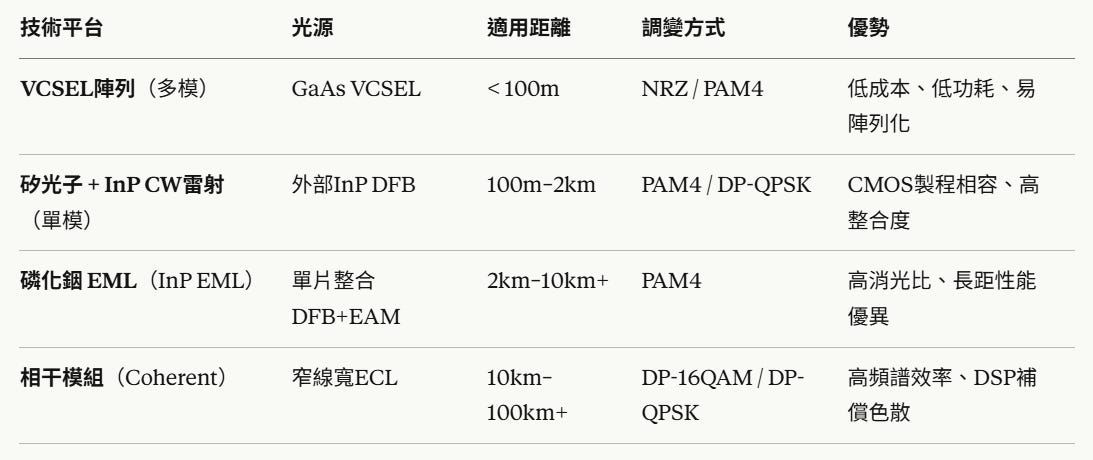 矽光子 + 遠端可插拔連續波雷射(CW Laser) 利用外部雷射源(通常為InP)透過光纖耦合進入矽光子晶片,規避矽光子難以直接整合雷射的材料限制。適合大規模量產,成本具競爭力。
