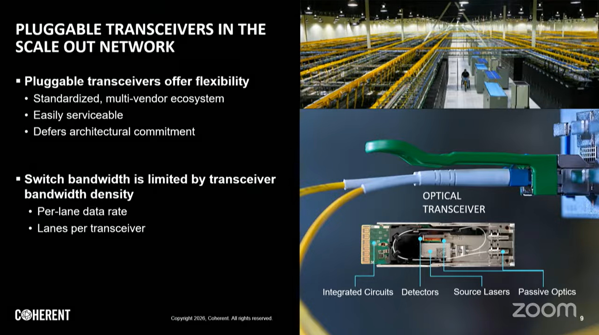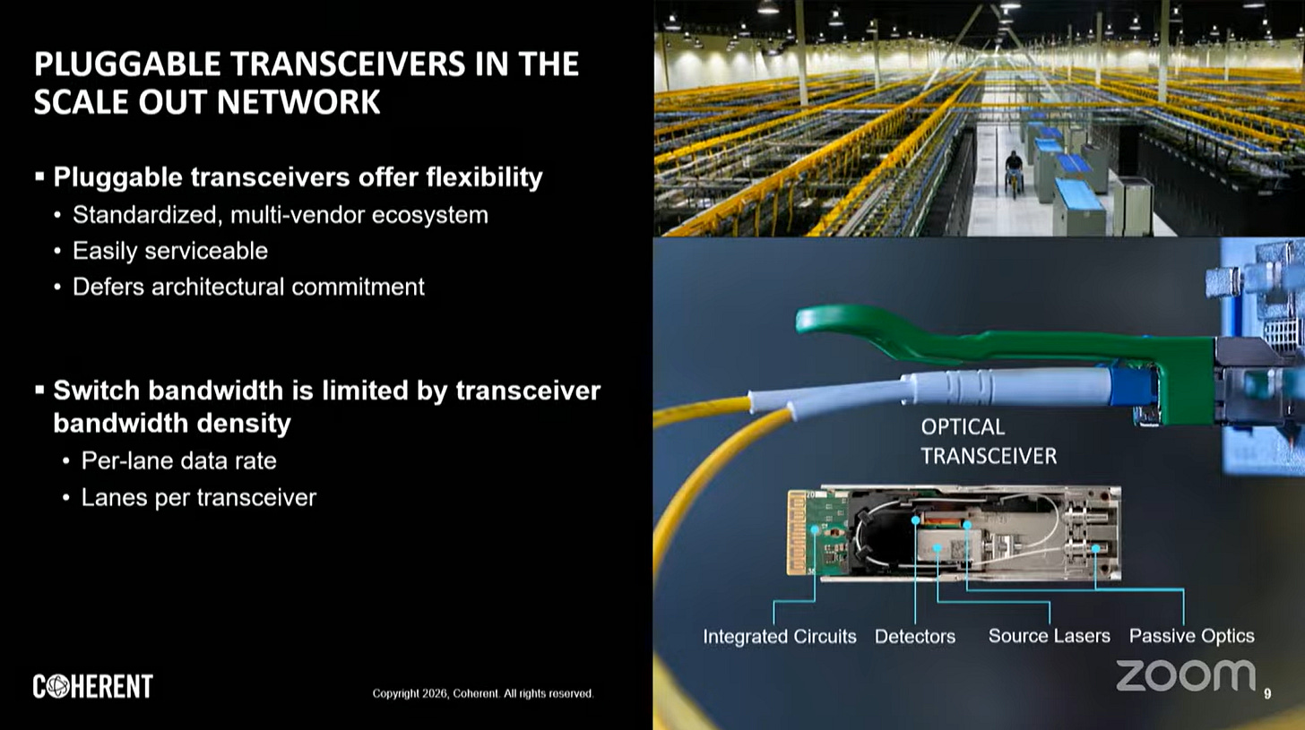 Scale Out域因設備異質性、鏈路距離跨度(10公尺至10公里)及多廠商互通性需求,可插拔收發器仍是主流解決方案。