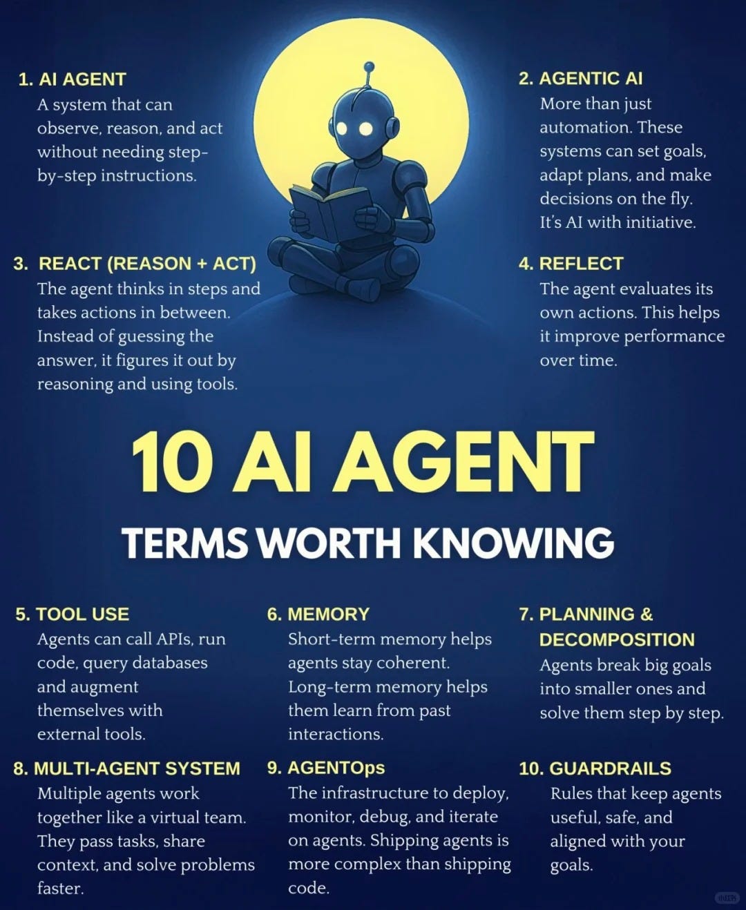 上圖清晰地定義了AI Agent領域中十個最關鍵的概念,它們共同構成了理解和構建現代AI Agent的基礎。
