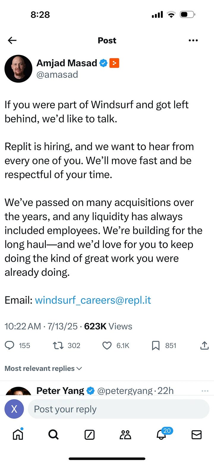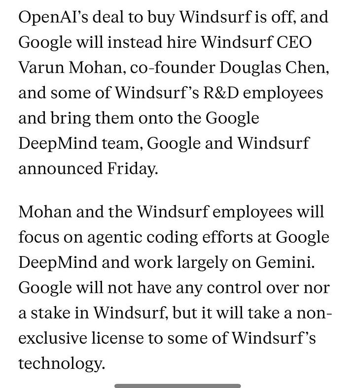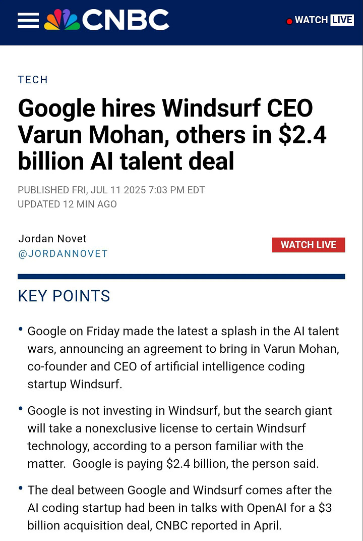 7 月 11 日,一起原看似即將完成的併購案突然生變,引發AI創業圈震盪。原本傳出即將以 30 億美元被 OpenAI 收購的 AI 編程工具新創公司 Windsurf,最終卻轉向 Google,以 24 億美元將創辦人與核心工程團隊打包出售給 Gemini,留下公司與數百名員工陷入無人領航的局面。(根據 Reuters 報導,Windsurf 的約 250 名員工 被列為「大多數員工將繼續留在公司」)