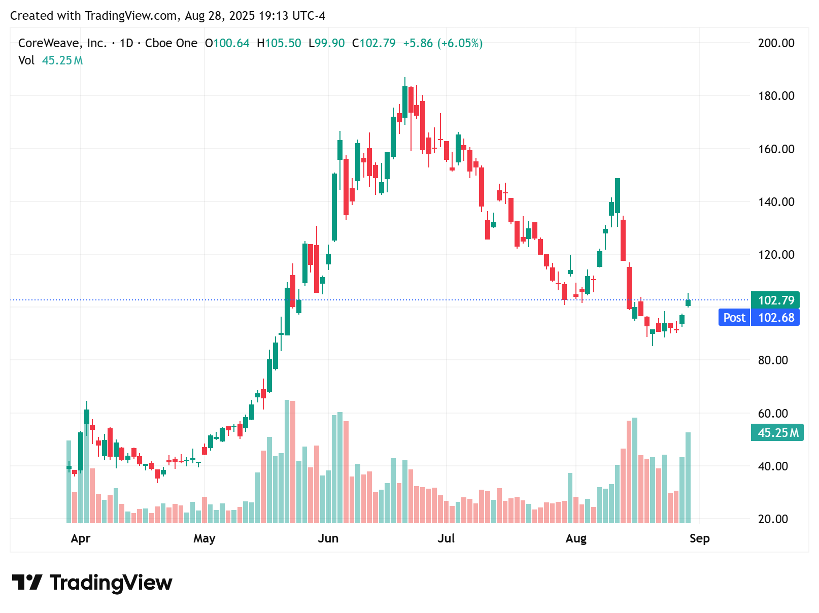 CoreWeave (CRWV):受 Google 投資 90億美元雲與AI基建利多,大漲突破105。