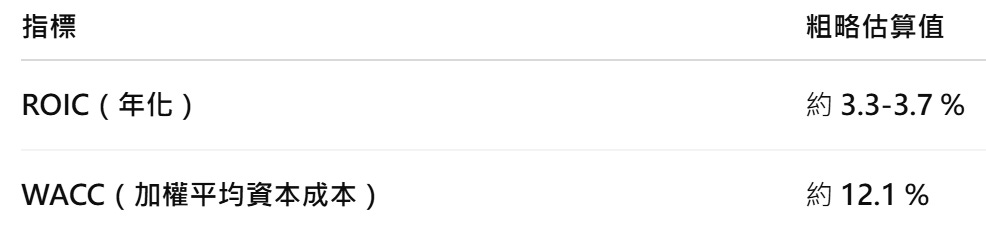 Tesla 2025 年第二季 10-Q 報表,算出該公司的 ROIC (投入資本回報率) 與 WACC (加權平均資本成本),如下: