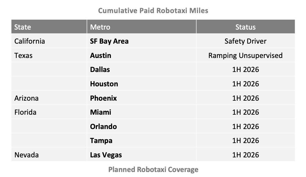 Robotaxi:已在奧斯汀開始移除安全人員進行測試,2026 年上半年將擴展至鳳凰城、拉斯維加斯等多個城市。
