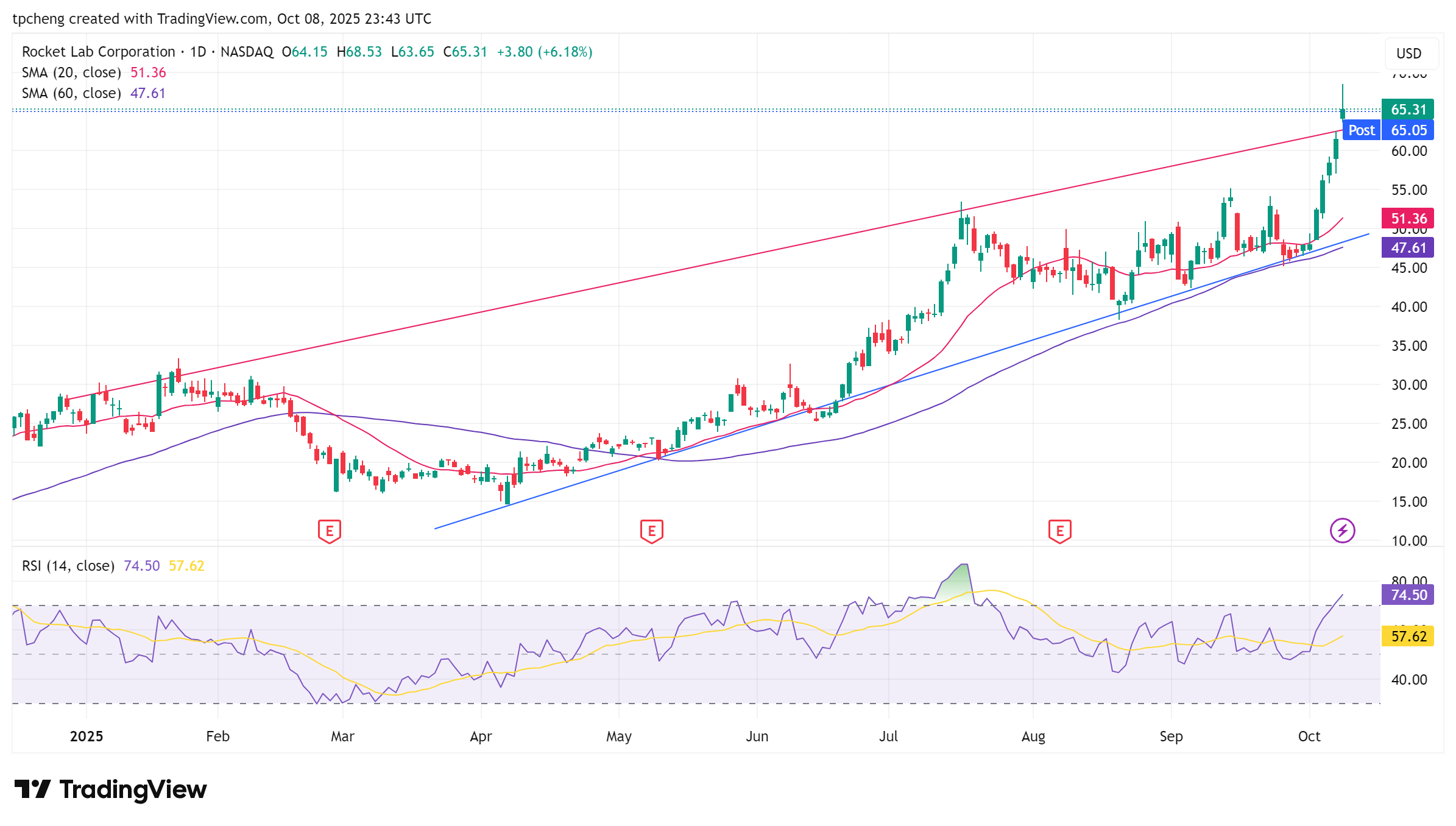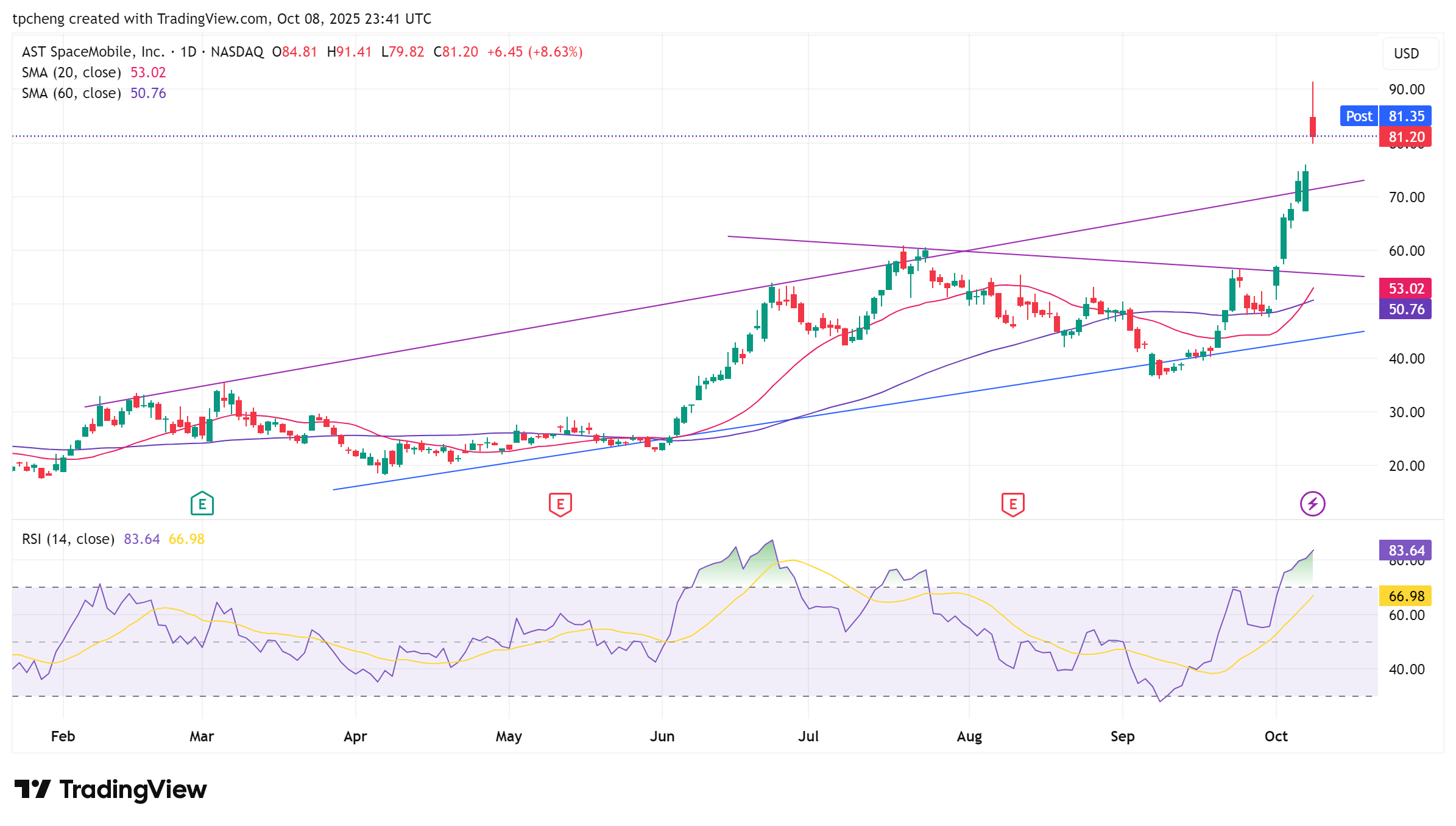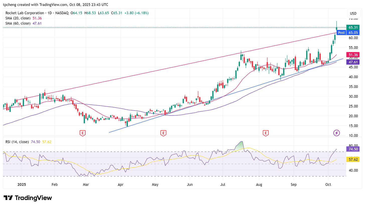 ASTS、Rocket Lab:受低軌衛星題材刺激連漲多日,但出現倒鎚線,短線警惕「利多出盡」。