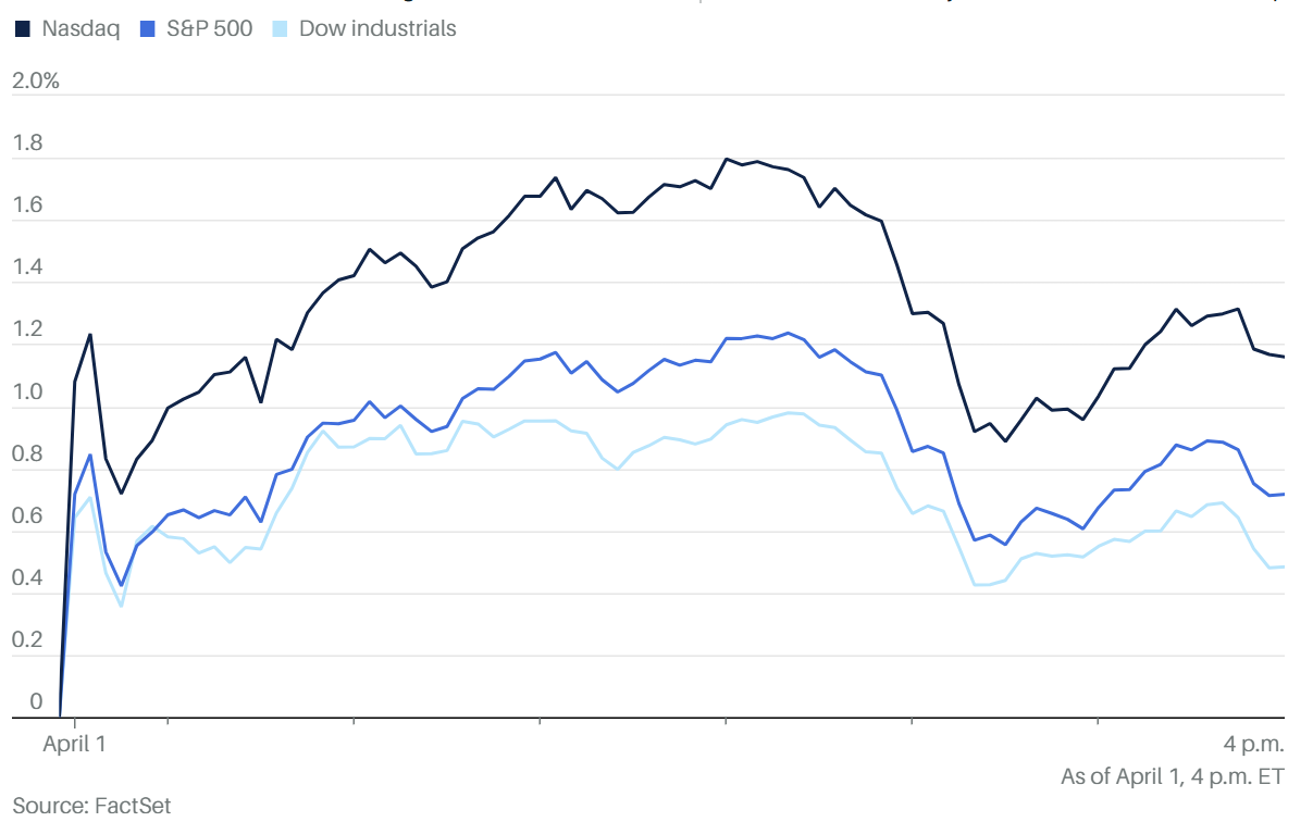 4月1日,美股迎來第二季度的首個交易日,延續了昨日的強勁反彈力道 。投資者對伊朗戰爭可能在短期內結束抱持「謹慎樂觀」態度,推動三大指數連續兩天收高 。其中,科技股雲集的那斯達克指數表現最為亮眼,收漲 1.2%;標普 500 指數與道瓊工業平均指數則分別上漲 0.7% 與 0.5% 。