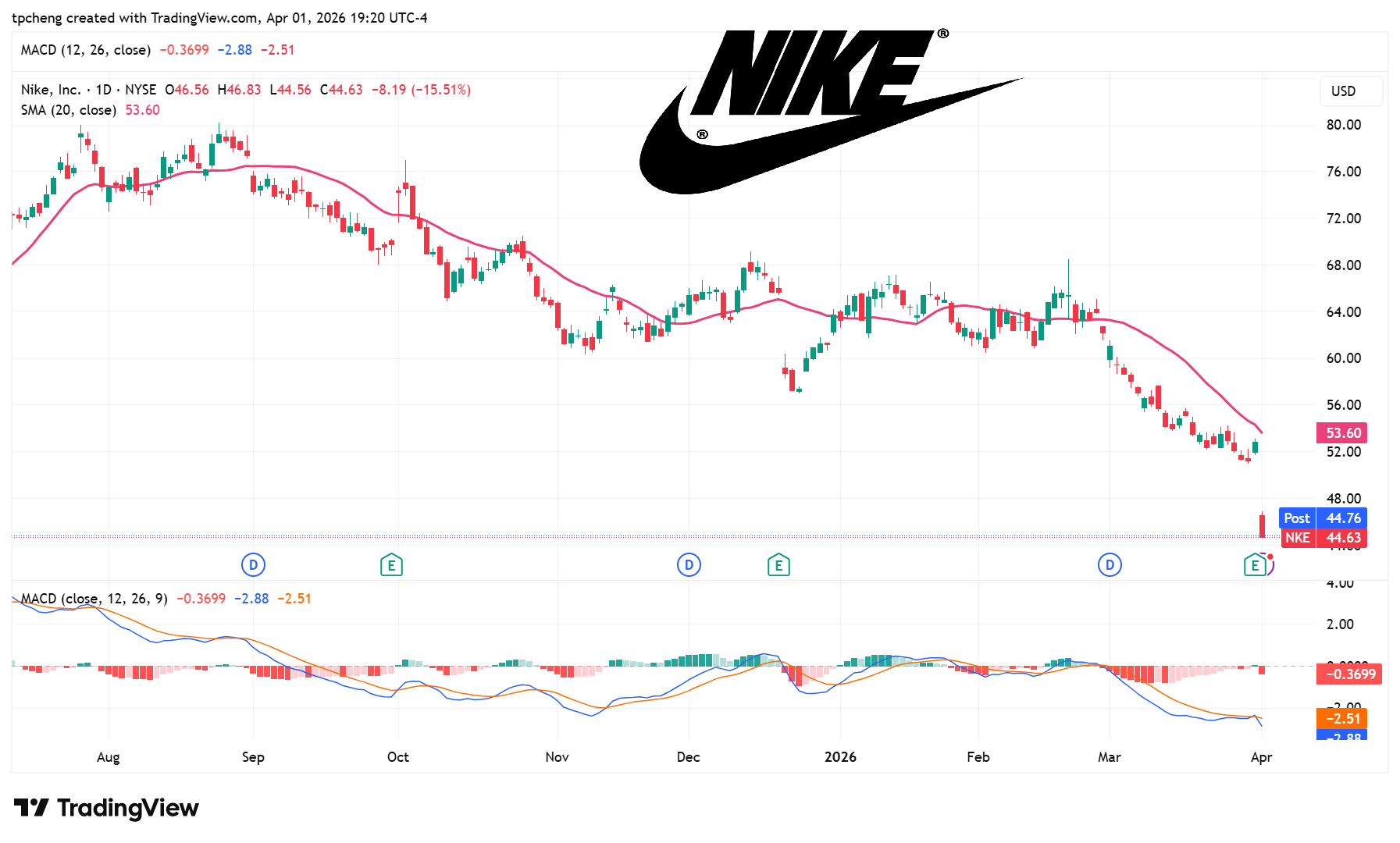 Nike(NKE)暴跌: Nike 今日重創逾 15%,股價跌至 2014 年以來的新低 。儘管第三季業績優於預期,但公司預測當季銷售將下降 2% 至 4%,其中中國市場預計暴跌 20%,令投資者深感憂慮 。