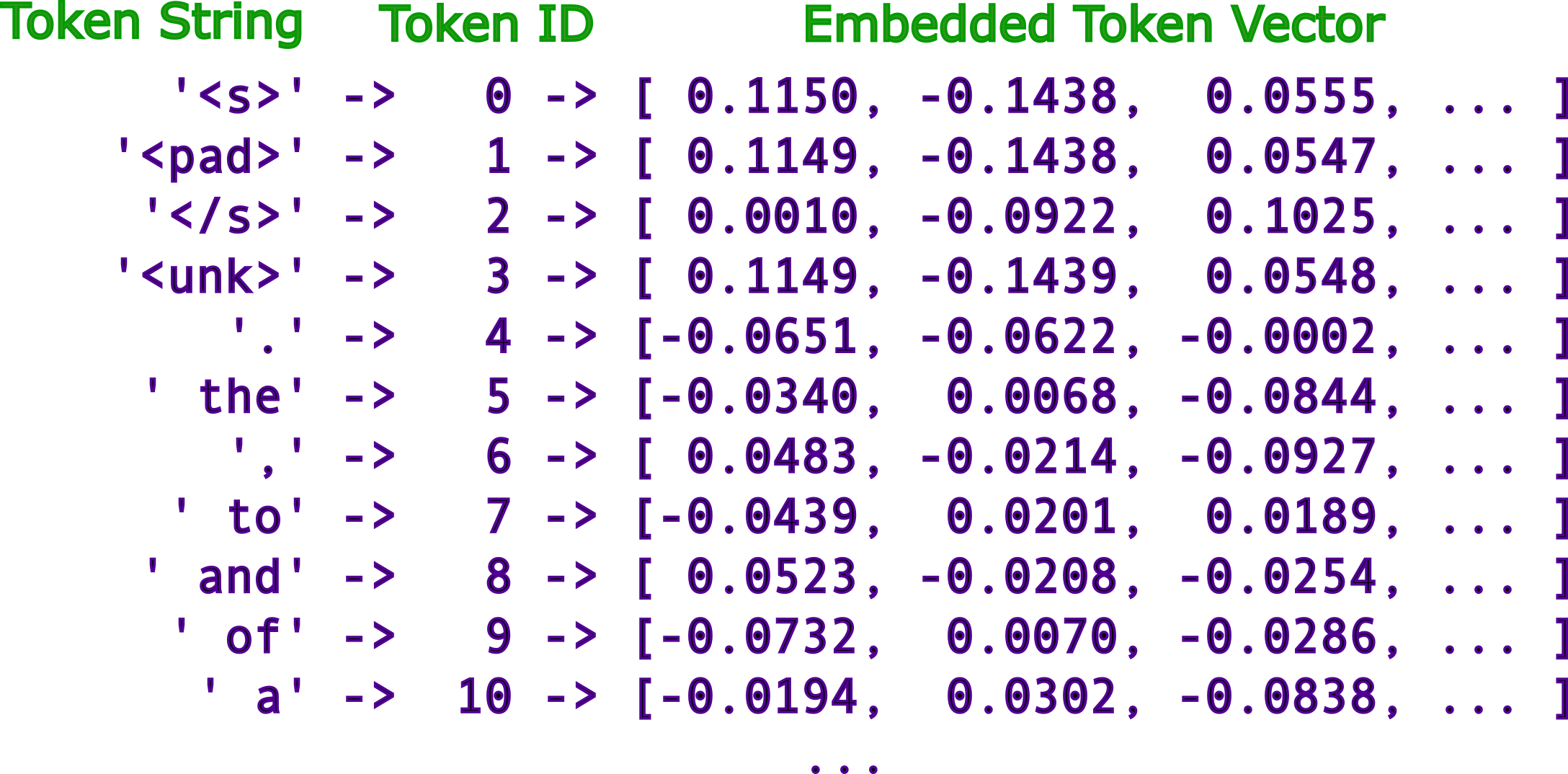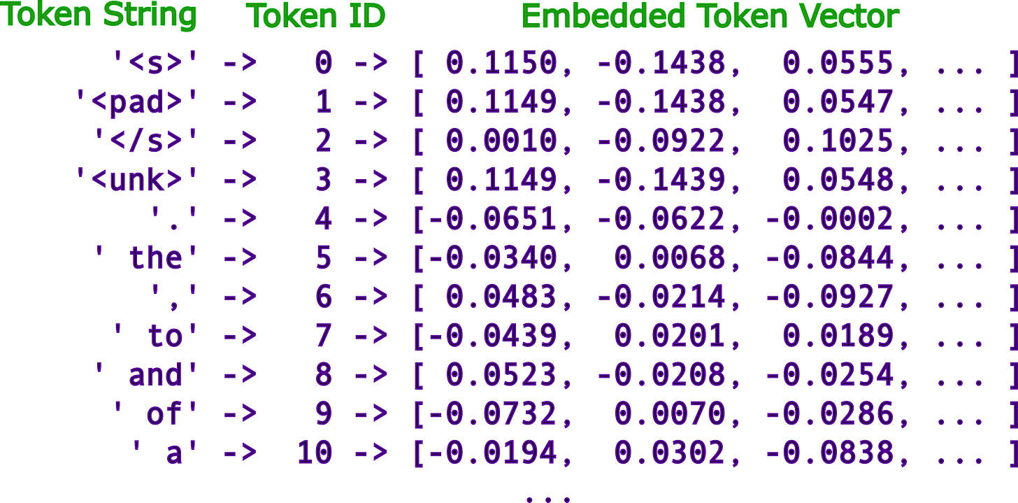 這些token ID 隨後通過嵌入層(embedding layer)轉換為高維數值向量,稱為嵌入向量(embeddings)。每個 token ID 對應一個由實數組成的密集向量(通常為512、1024或更高維度)。例如,「Hello」可能被表示為一個向量,如 [0.23, -0.45, 0.78, ...]。