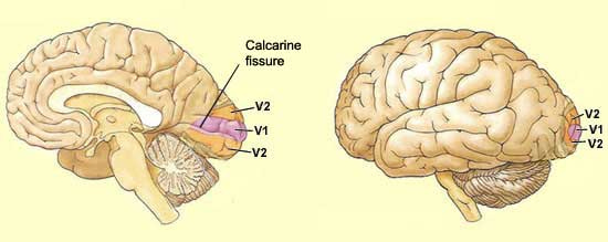 V2對V1提供的基本視覺資訊進行更進一步的處理,處理邊緣、輪廓、深度線索等資訊。V4的功能包含顏色感知(Color perception)、形狀辨識(Shape recognition)與物體辨識(Object recognition)。MT/V5的功能包含運動感知(Motion perception)、追蹤移動的物體、深度與速度的計算。