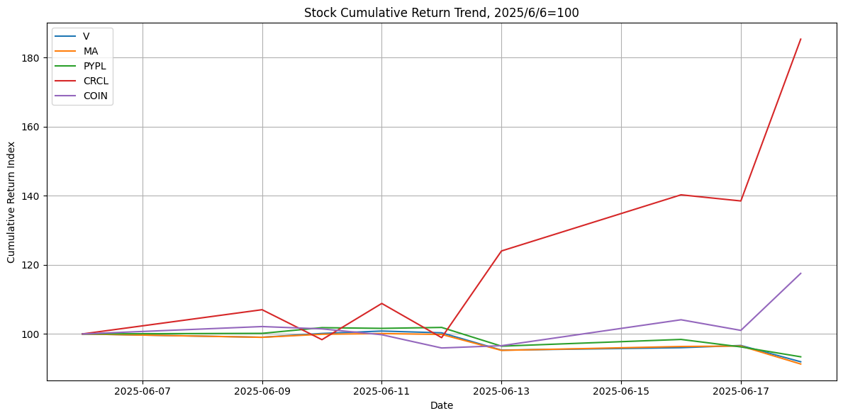 美國參議院通過穩定幣法案後,穩定幣發行商Circle Internet(CRCL)飆漲33.8%,盤後持續大漲6%;加密交易所Coinbase(COIN)股價大漲 16%。相對地,Visa 股價下跌4.8%,Mastercard下跌5.4%。市場預期,穩定幣支付系統可能讓商家繞過傳統信用卡網路。
