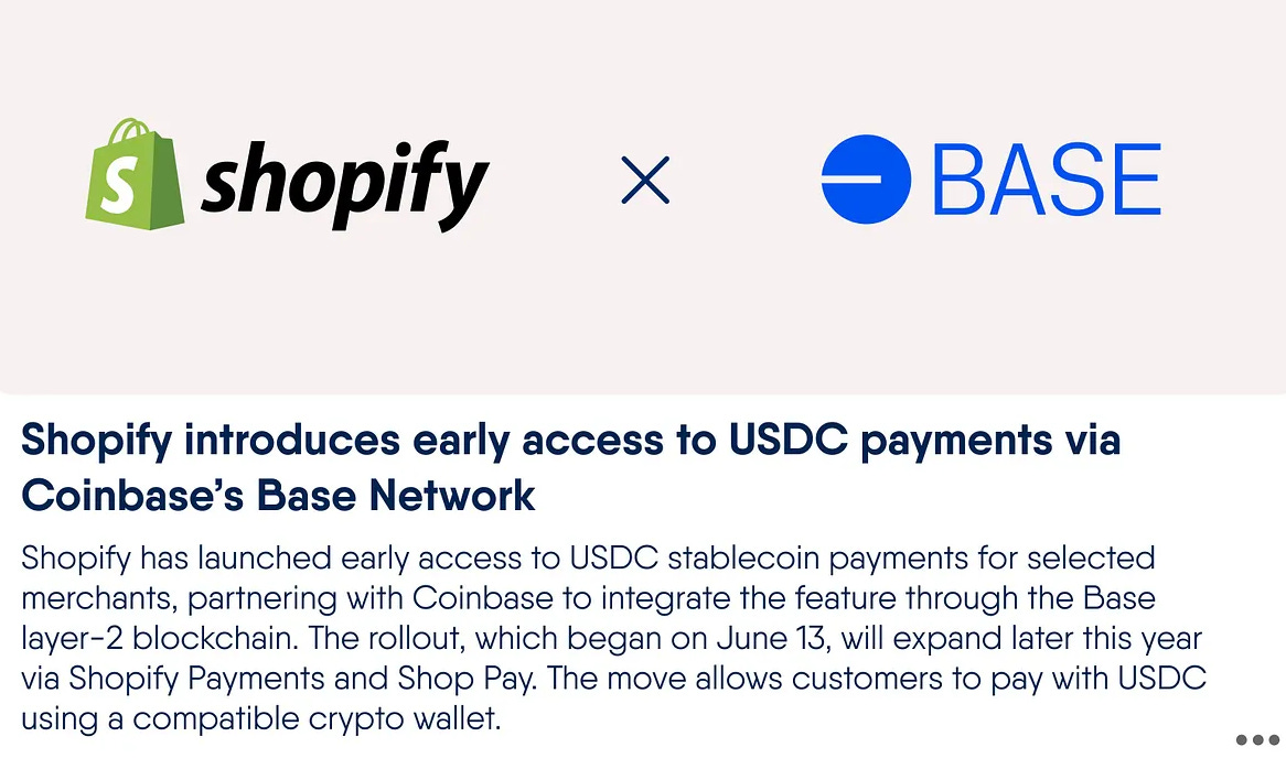 6 月 13 日,全球電商平台龍頭 Shopify 宣布,與加密貨幣交易所 Coinbase 及支付商 Stripe 合作,將允許商家接受以 USDC 為主的穩定幣支付。這項合作被業界視為可能改寫數位支付格局的重要一步。