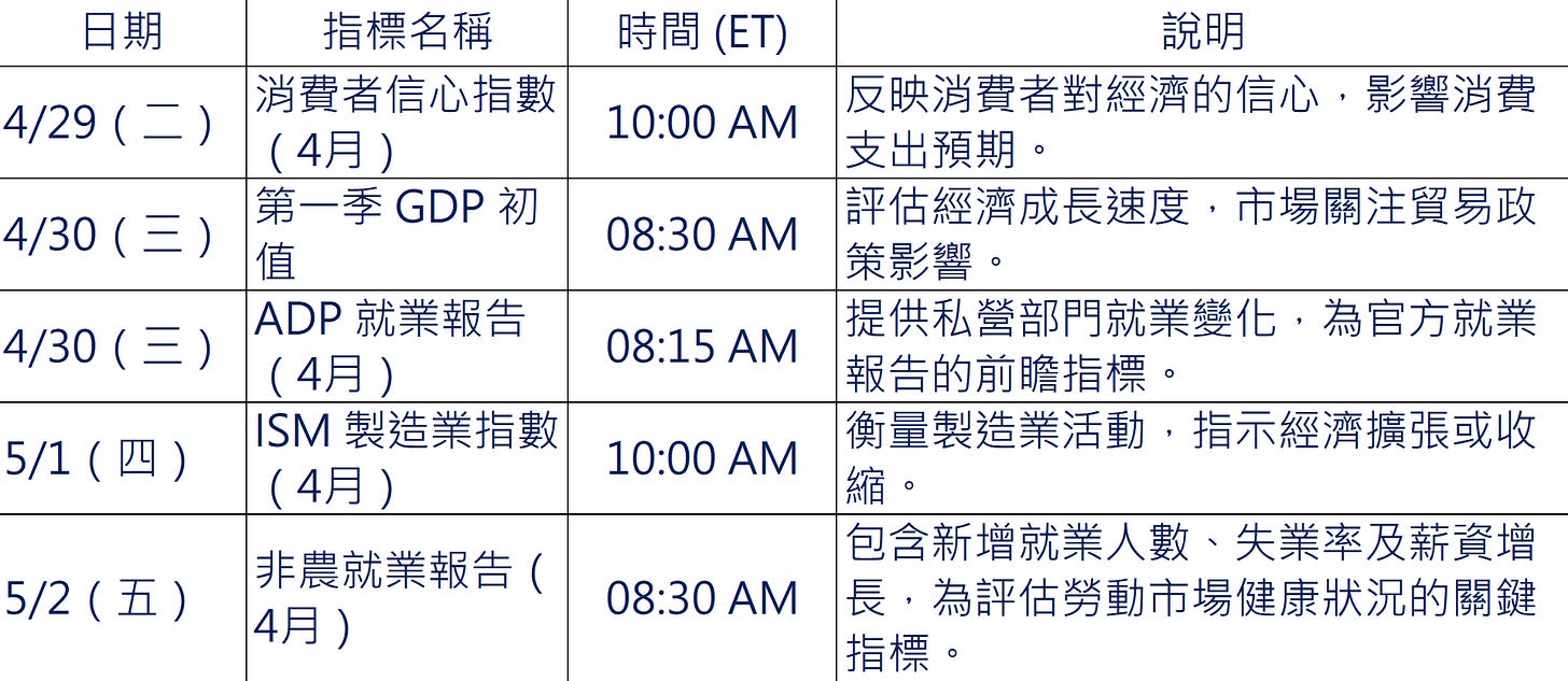 總統任期百日:4 月 30 日為總統川普第二任期的第 100 天,市場關注其貿易政策對經濟的影響。