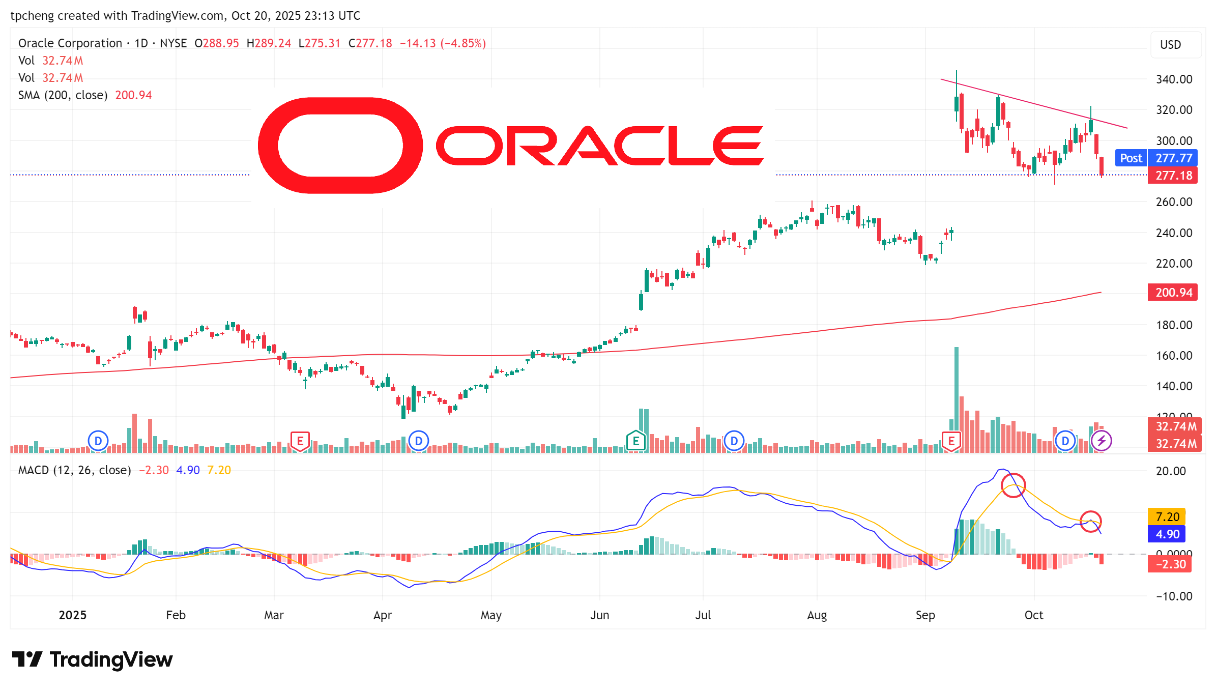 甲骨文(Oracle)跌4.85%,因OpenAI 3000億美元訂單資金來源不明;