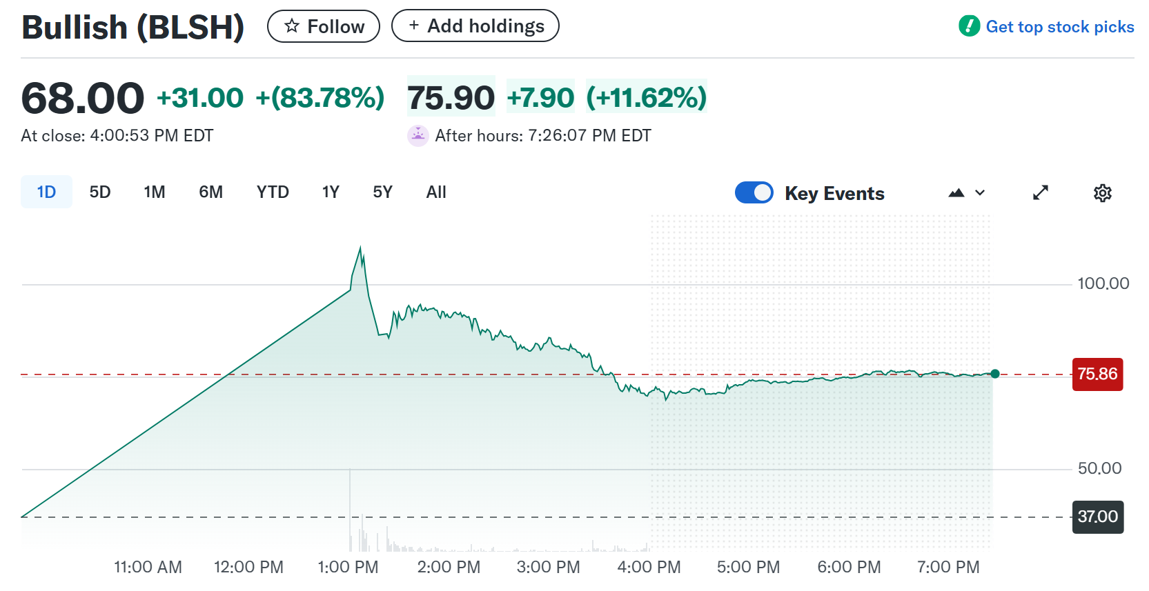 數字資產交易平台,IPO 定價 37 美元,開盤 90 美元,高見 118 後收 68 美元;估值高於 Coinbase,短期炒作為主。