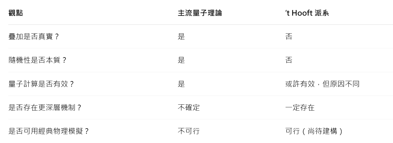 若如’t Hooft 所說,「疊加只是數學上的表示,而非真實存在」,那整個量子加速的基礎就被動搖了。換言之,量子計算機未必真的是在「同時計算指數多的輸入」,而只是某種極精巧的機率模擬。