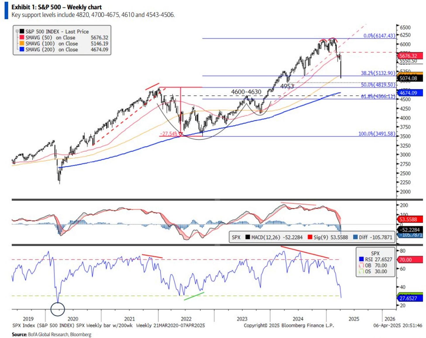 若以週線K線圖檢視,這一波上漲可追溯至2022年聯準會(Fed)停止升息開始,至2025年1月達到高點。如今進入修正期,預估至少會延續半年左右。從MACD轉為負值來看,走勢更接近2022年的型態,而非2020年那般迅速反彈。