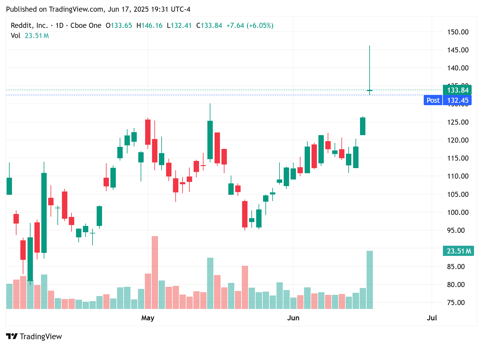 Reddit炒作後回落:AI 廣告功能帶動一度暴漲,但技術面倒錘線收尾。