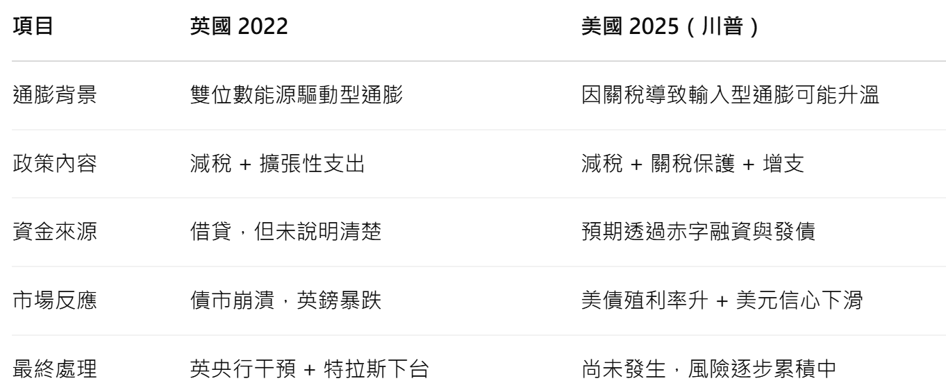 美國作為全球儲備貨幣的發行國,擁有更強的緩衝空間,但如果川普重施減稅、關稅與干預型政策,加上債務規模本就遠超英國,美國將更難找到「央行來救場」的空間,而美元資產的安全神話,可能會面臨破滅的真正考驗。