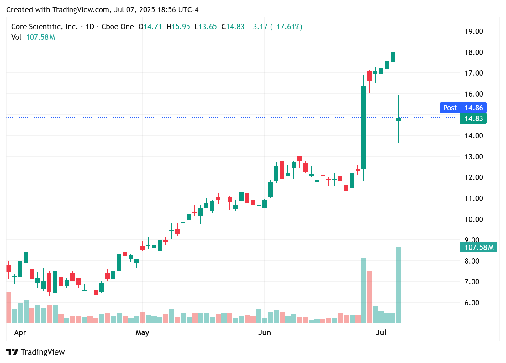 Core Scientific (CORZ) -18% / CoreWeave (CRWV) -3.3%