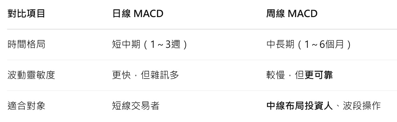 周線 MACD 能幫我們「濾掉震盪雜訊」,只專注趨勢本體。