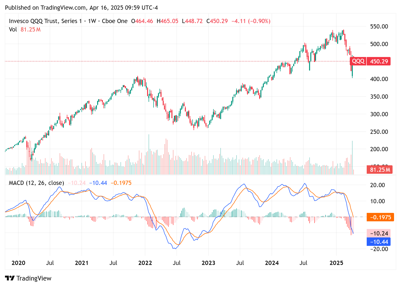目前處在MACD 線下穿 Signal 線(死亡交叉)起算的第四週,MACD 線 < 0 軸,Histogram 擴大中,空方動能在增強,簡單地說,空頭壓力大,空方趨勢仍在發展過程中,尚未看到反轉或Histogram縮小情況,剛降槓桿或停損的投資人,切勿貿然進場。但此前已先出場的投資人,則可以留意日線 MACD 轉好訊號,重新建立部位。