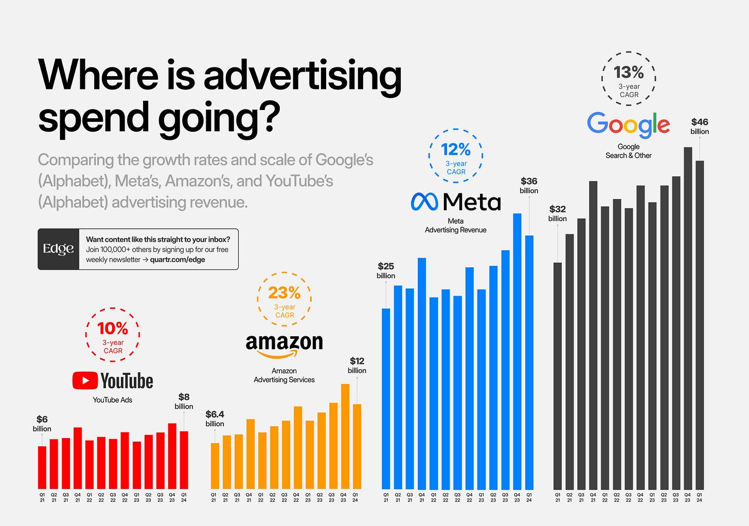 Amazon的優勢: 憑藉龐大的零售平台和豐富的用戶數據,Amazon能夠提供高針對性的廣告服務,這使其廣告業務快速崛起。