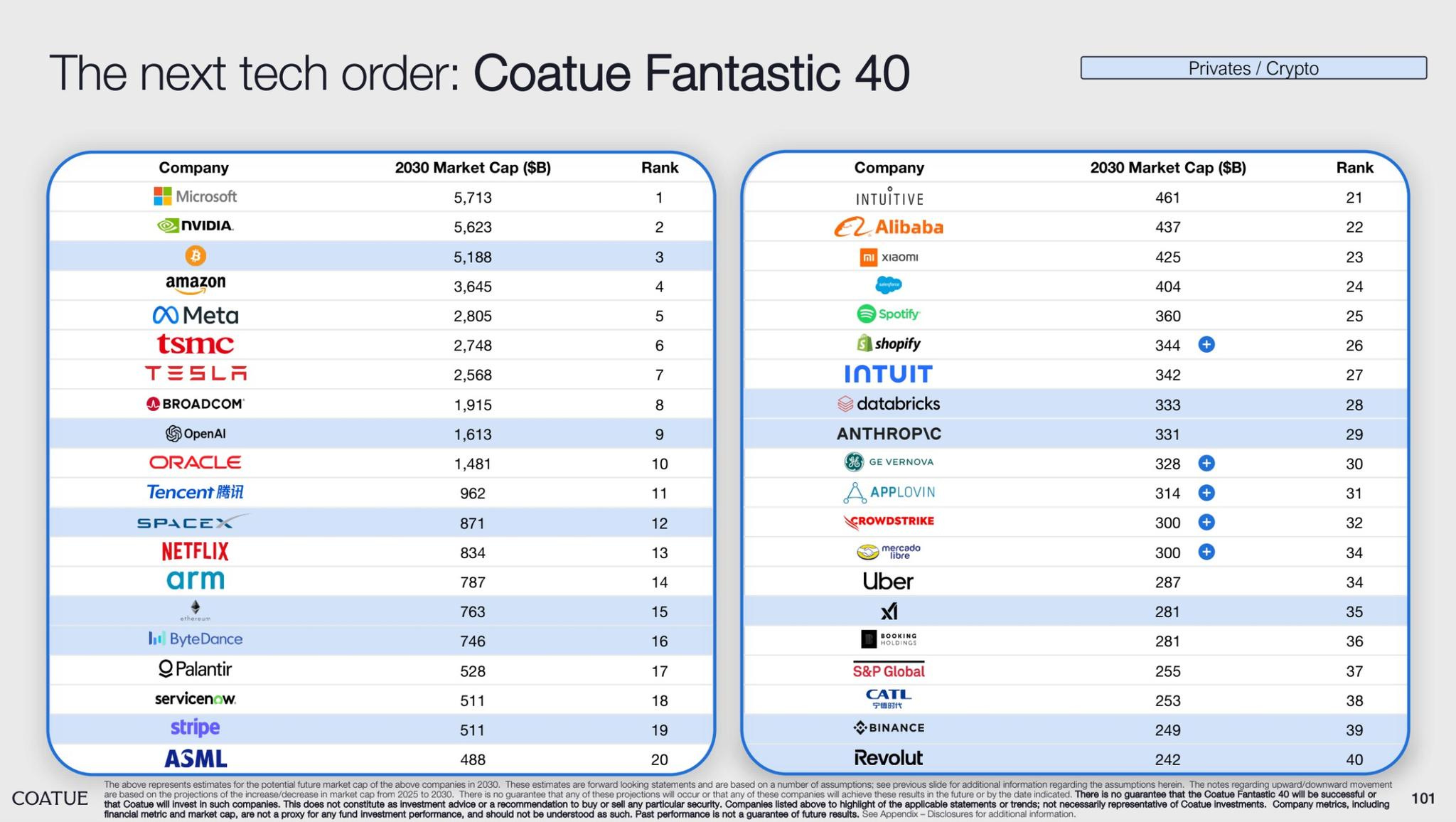 壓軸為 Coatue 發布的「2030 Fantastic 40」預測榜單,預計 Microsoft、NVIDIA、Bitcoin 將領銜市值榜,並納入 OpenAI、Stripe、Palantir、Anthropic 等新興基礎設施供應商。此榜單基於供應鏈流、token 消耗與 AI 滲透率模型推演,描繪出 AI 經濟下的資源核心網絡。